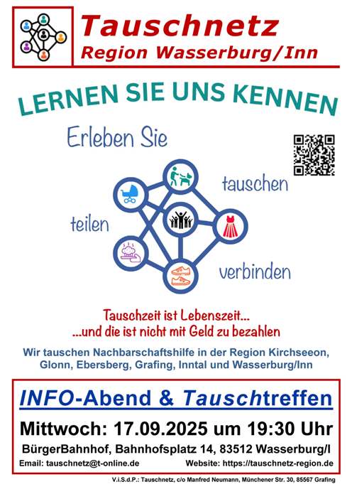 Unter dem Motto: „Lernen Sie uns kennen“: Ein Info-Abend mit einem Tauschtreffen am Mittwoch, 17. September, um 19.30 Uhr im Wasserburger Bürger-Bahnhof bietet eine gute Gelegenheit, Menschen aus Wasserburg und Umgebung und das Tauschnetz mal kennen zu lernen.