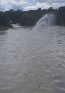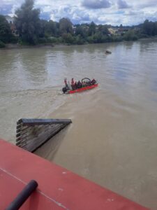 Nach einer kurzen Mittagspause ging es in die Praxis. Am Nachmittag führten die Einsatzgruppen der Wasserwacht und Feuerwehr gemeinsam Lösch- und Rettungsübungen auf dem Wasser durch. Verschiedene Szenarien wurden simuliert: Das Verbringen einer Pumpe der Feuerwehr auf das Motorrettungsboot der Wasserwacht um innseitige Löscharbeiten zu erproben, eine Personenrettung aus dem Wasser, eine Vermisstensuche und das Auffinden einer bewusstlosen Person in der Böschung am Innufer. Die Zuschauer konnten beobachten, wie Bootsteam und Jetski der Wasserwacht, gemeinsam mit der Feuerwehr Hand in Hand arbeiteten, um Gefahren zielgerichtet zu entschärfen.