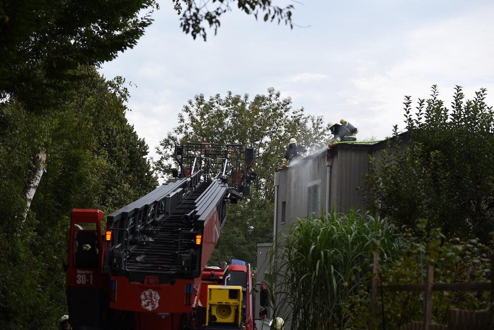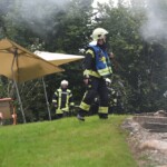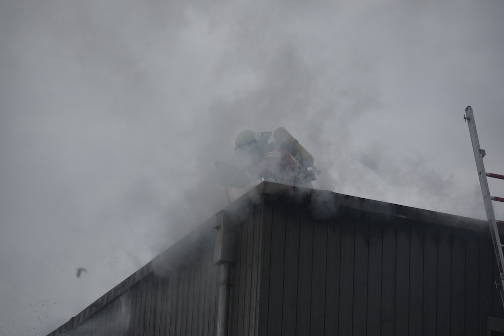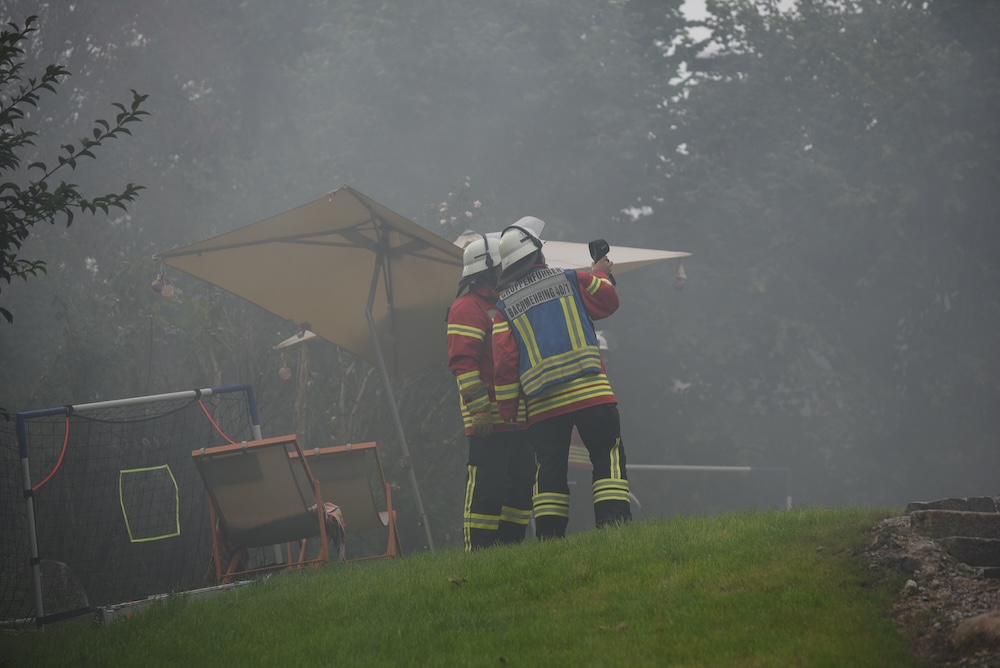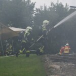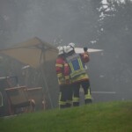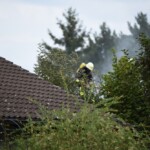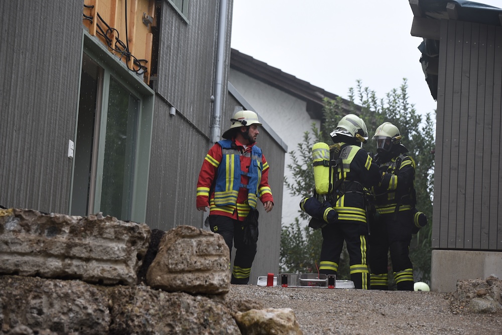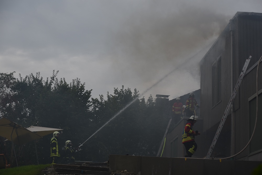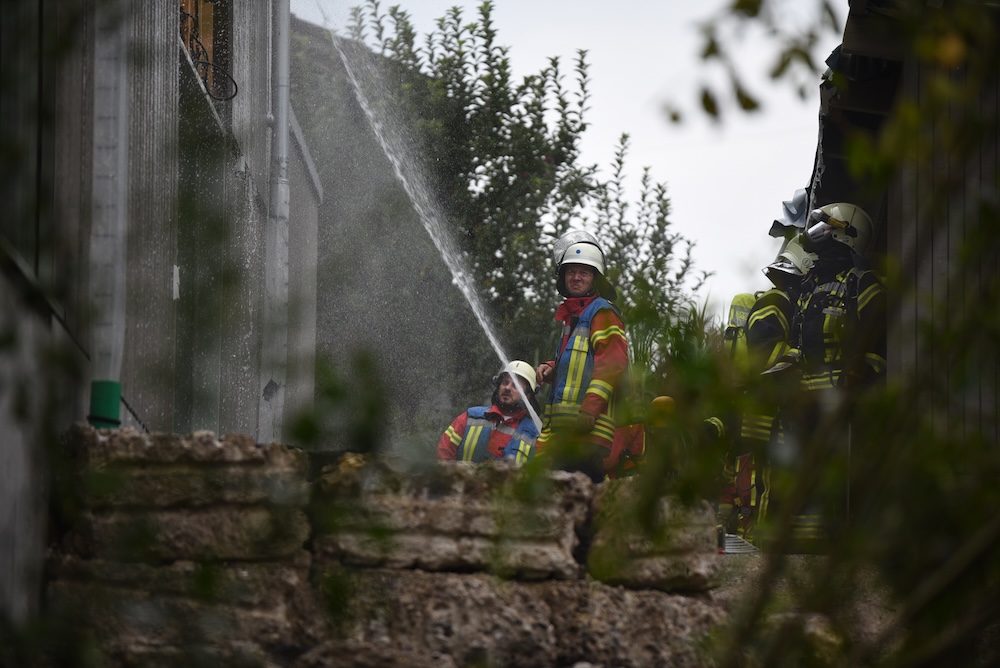 Was fürs Wohnen gut ist, ist beim Löschen eine gefährliche Erschwernis: „Es handelt sich hier um moderne, wasserabweisende Dämmstoffe, die logischerweise mit Wasser nicht oder nur schwer zu löschen sind. Und deshalb werden die Löscharbeiten noch mehrere Stunden in Anspruch nehmen“, wie der Kreisbrandinspektor gegen 17.30 Uhr befürchtete.