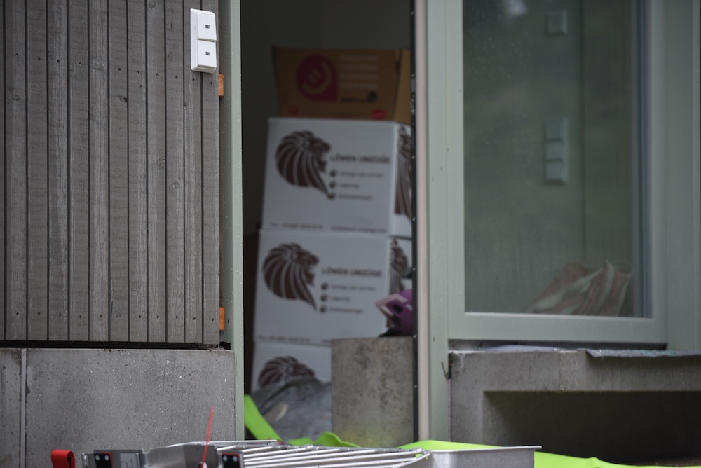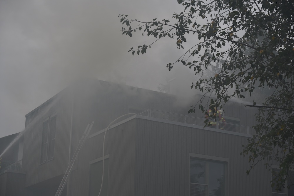Zur Sicherheit: Die gesamte Außenverkleidung des Neubaus wird entfernt. Noch heute Abend soll mit Hilfe der Drehleiter ein Notdach auf das Haus kommen.