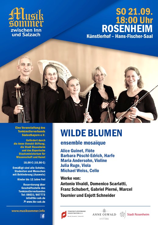 „Wilde Blumen“ – so heißt der besondere Titel eines Konzerts in der nächsten Woche: Zum letzten Sommertag am Sonntag, 21. September, spielt das „ensemble mosaïque“ mit den Künstlern Alice Guinet (Flöte), Barbara Pöschl-Edrich (Harfe), Maria Andersohn (Violine) und Julia Ruge (Viola) sowie Michael Weiß (Cello). Im Rahmen des 50-jährigen Jubiläums der Konzertreihe „Musiksommer zwischen Inn und Salzach“ ist es das neue Programm des Ensembles.