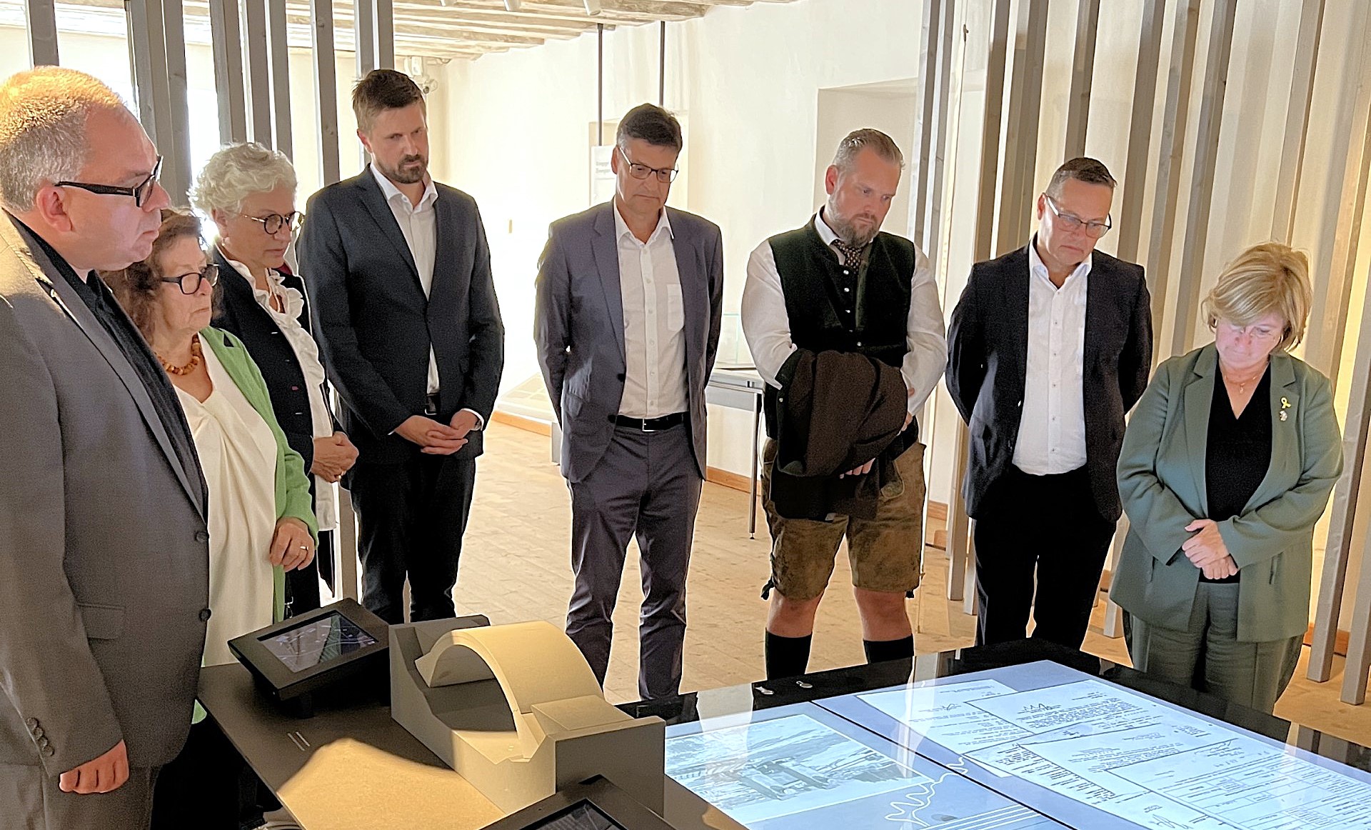 Korbinian Engelmann (Leiter Geschichtszentrum Museum Mühldorf), Landrat Max Heimerl und die Mitglieder des Landtags