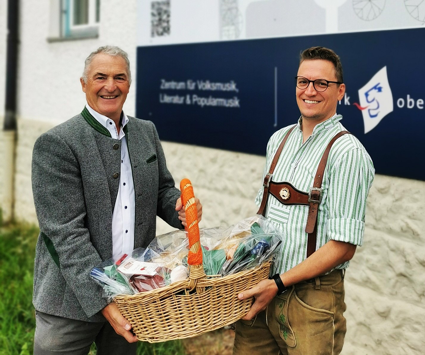 Der Fraktionsvorsitzende der Freien Wähler im oberbayerischen Bezirkstag, Sepp Hofer (links im Bild), übergab jetzt dem scheidenden, hauptamtlichen Volksmusikwart des Bezirks Oberbayern – Leonhard Meixner (rechts) – einen Geschenkkorb.