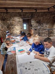 Anschließen durften sich die Kinder zum Malen an die große Rittertafel setzen. Hierbei entstanden kleine bunte Kunstwerke, die jetzt am Eingang des Schlossturms hängen und dort von außen von den Spaziergängern betrachtet werden können.