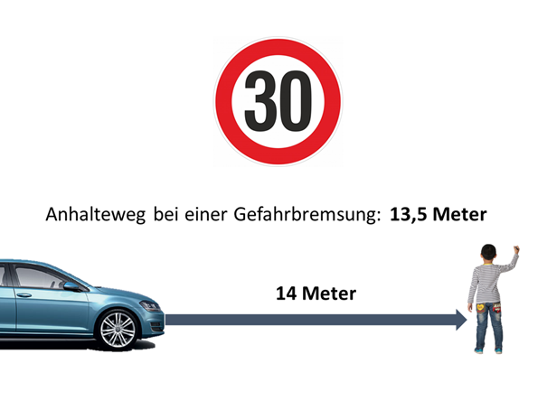 Bei 30 km/h schaffen Sie es bei guter Reaktion, knapp vor dem Kind anzuhalten. Der Anhalteweg vom Erkennen der Gefahr bis zum Stillstand des Fahrzeugs beträgt bei dieser Geschwindigkeit nach der Faustformel, die sich tatsächlich nah an der Realität bewegt, rund 13,5 Meter.