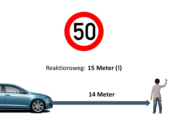 Bei einer Geschwindigkeit von 50 km/h beträgt hingegen allein der Reaktionsweg 15 Meter. Das heißt, dass das Kind mit voller Geschwindigkeit erfasst wird, bevor Sie überhaupt reagieren können.