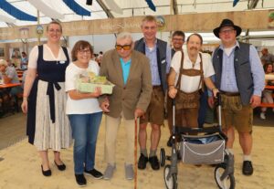 Auf dem Tanzboden in der Mitte des Festzelts Bühne bekamen sie einzeln von Ludwig Fritz als Seniorenvertreter der Stiftung Attl einen Geschenkkorb überreicht. Die Festwirte Andreas Eberherr, Konrad Stemmer und Florian Ott geleiteten sie mit musikalischer Unterstützung von der Vogtareuther Blaskapelle dorthin und brachten sie natürlich auch wieder sicher zu ihrem Platz zurück.