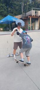 Gemeinsam mit den Profis fand an zwei Terminen ein kleiner Skate-Workshop, der für die Teilnehmer*innen kostenlos war, statt. Es waren insgesamt zwölf Jugendliche angemeldet. Da der Skateplatz für alle öffentlich zugängig ist, waren an beiden Terminen auch einige andere Skater vor Ort. Es war dabei schön zu sehen, dass alle aufeinander Rücksicht genommen haben und die erfahreneren Skater den Neulingen mit Tipps zur Seite standen. So ist die Stimmung am Wasserburger Skateplatz immer ganz besonders und lädt auch Zuschauer zum Verweilen ein.