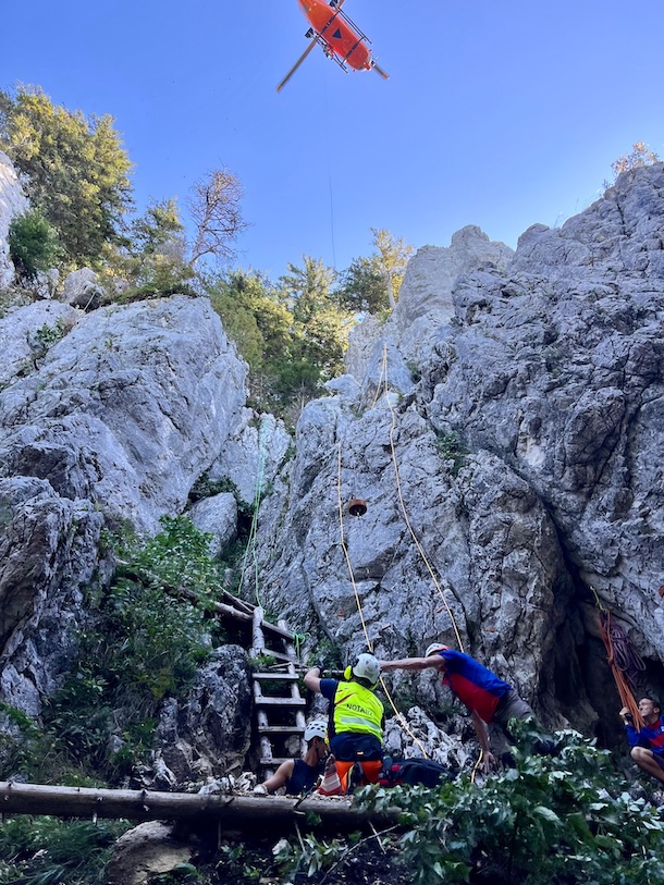 Die Einsatzkräfte der Bergwacht erreichten den Patienten am Wandfuß und übernahmen umgehend die Erstversorgung. Der Mann hatte großes Glück: Trotz des Sturzes zog er sich lediglich eine Verletzung am Sprunggelenk zu. Da ein Abtransport über das Gelände nicht schnell und schonend möglich war, wurde der Verletzte mithilfe eines Rettungsdreiecks sitzend durch den Hubschrauber vom Wandfuß geborgen und anschließend in eine Klinik geflogen.