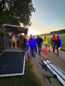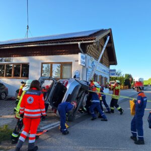 Im Laufe des Tages folgten weitere realitätsnahe Einsatzszenarien, darunter ein kleiner Flächenbrand, ein Verkehrsunfall mit eingeklemmten Personen, bei dem die Bereitschaft Haag unterstützte und ein Gefahrguteinsatz. Ergänzend dazu wurde den Jugendlichen eine Übungseinheit mit der BRK-Rettungshundestaffel Mühldorf geboten, bei der eine vermisste Person gesucht wurde.