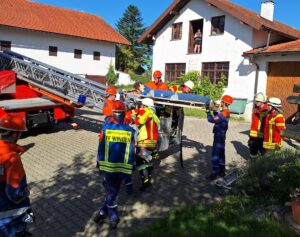 Die Übung startet am Samstagmorgen um 9 Uhr mit dem Einzug ins Feuerwehrhaus. Bereits kurze Zeit später wurde der erste Alarm ausgelöst: „Medizinischer Notfall“ lautete das Einsatzstichwort. Ausgerüstet mit der Schutzkleidung der Jugendfeuerwehr rückten die jungen Nachwuchskräfte mit ihren Betreuern aus. Ein besonderes Highlight hier war die Unterstützung der Drehleiter aus Haag.