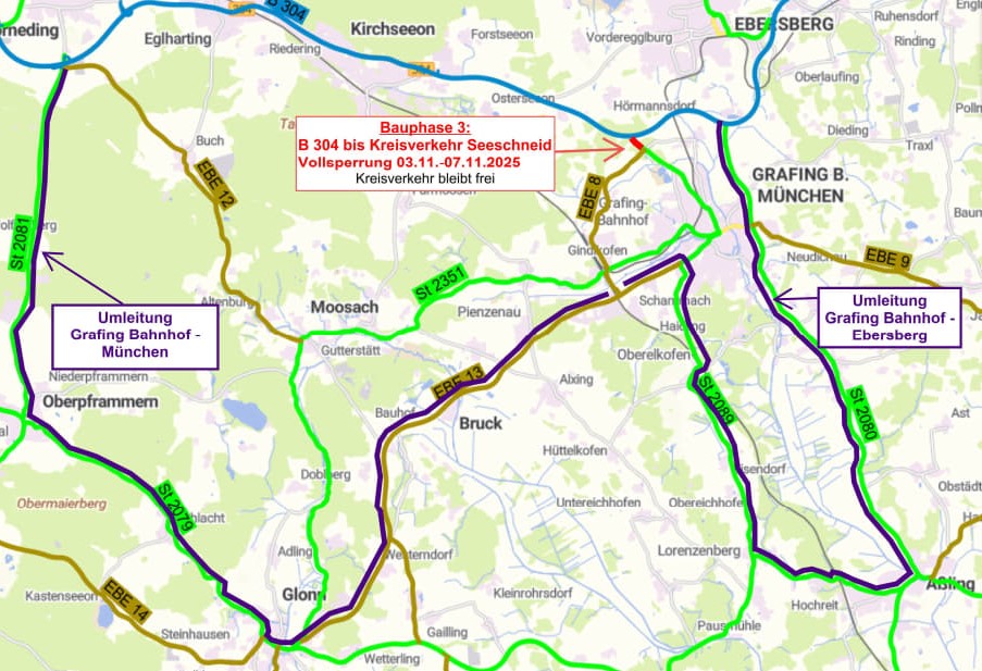 Dritter und letzter Bauabschnitt ist der Bereich zwischen dem Kreisel bei Seeschneid und der B 304. Läuft alles nach Plan, starten die Arbeiten in diesem Abschnitt am Montag, 3. November, und dauern bis einschließlich Freitag, 7. November. Während dieser Zeit muss der Verkehr großräumig umgeleitet werden. In Richtung München geht die Umleitungsstrecke über Glonn, Oberpframmern und Zorneding. In der Gegenrichtung verläuft die Umleitung ab Grafing Bahnhof über Aßling, die St 2080 sowie die Ortsumgehung Grafing. Die Umleitungsführung wurde mit dem Landkreis Ebersberg, der Polizei sowie weiteren gemeindlichen Behörden abgestimmt und ist vor Ort beschildert.