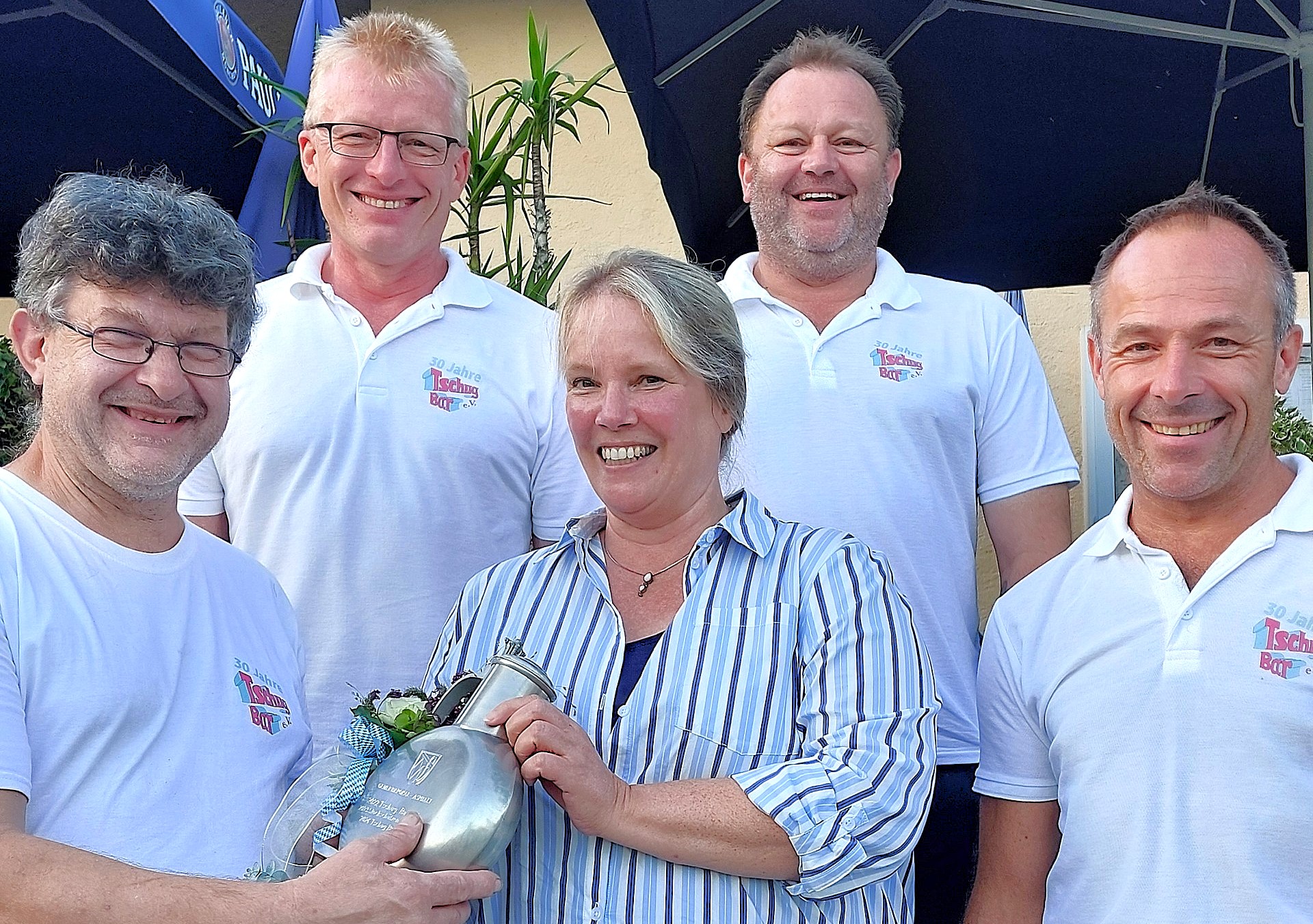 Bei der anschließenden Siegerehrung im Sportheim „Amedeo“ wurde der schön geschmückte Gemeindepokal von der Dritten Bürgermeisterin Nicole Bauer-Schäfer an die glücklichen Sieger überreicht, die den Pokal nun nach dreimaligem Gewinn behalten dürfen.
