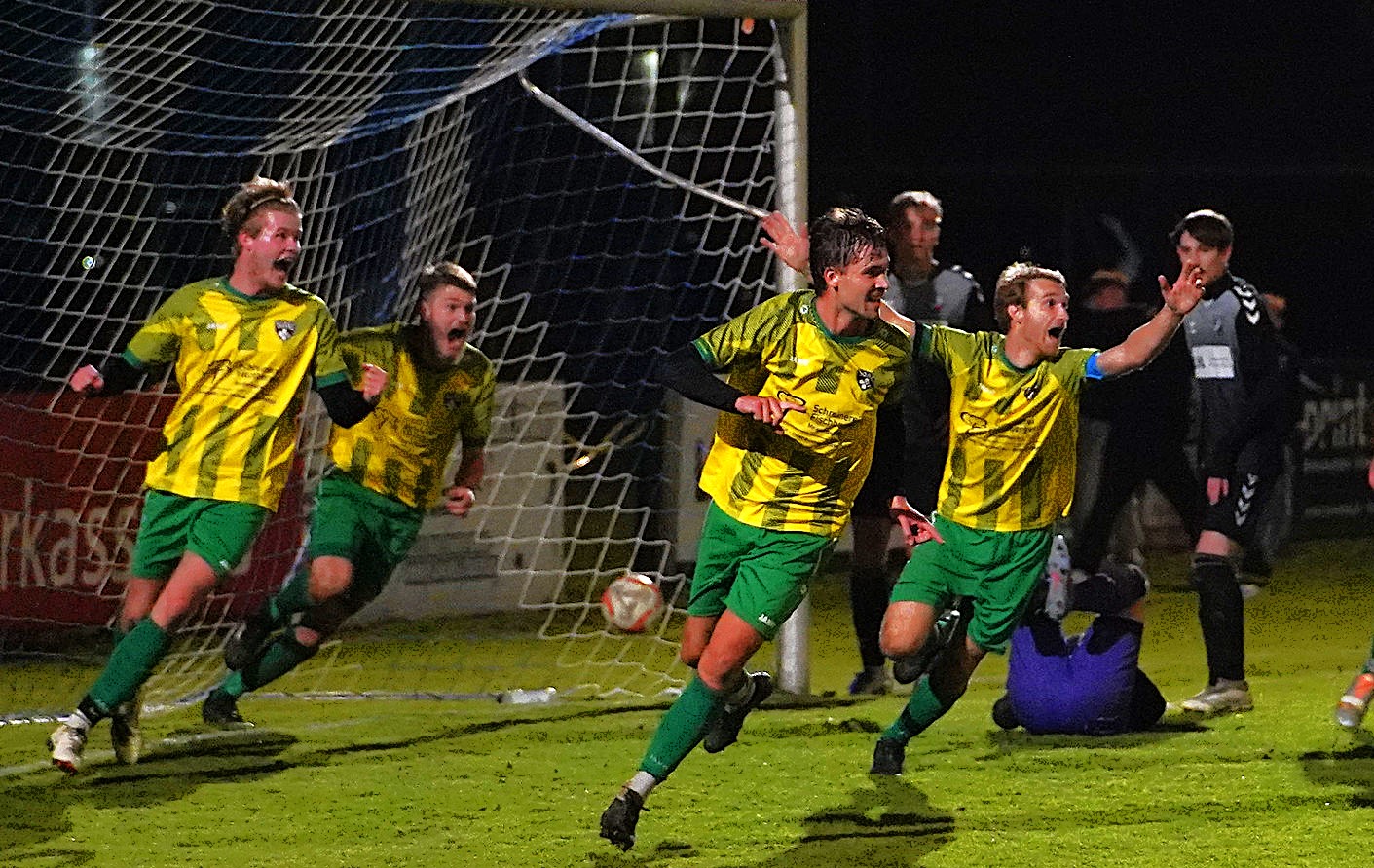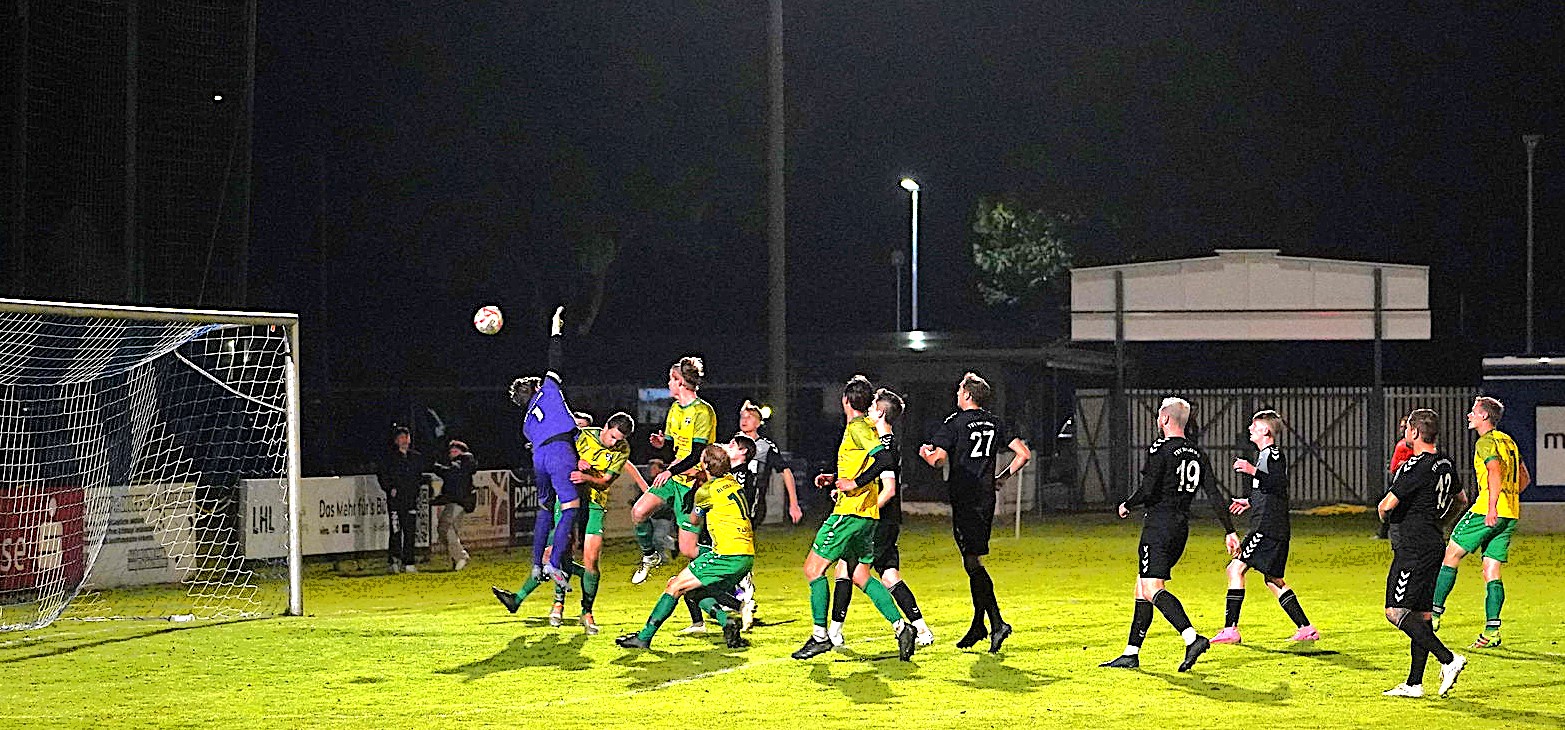 Lucky Punch gestern in der Nachspielzeit – Andreas Hundschell lässt die SG RRG in Neuötting jubeln: Es lief bereits die fünfte Minute der Nachspielzeit, als ein Freistoß von Andreas Hundschell aus 45 Metern hoch in den Strafraum segelte – siehe Foto unten – der Neuöttinger Keeper sich verschätzte und der Ball zum späten 1:0 für die SG RRG im Tor landete.