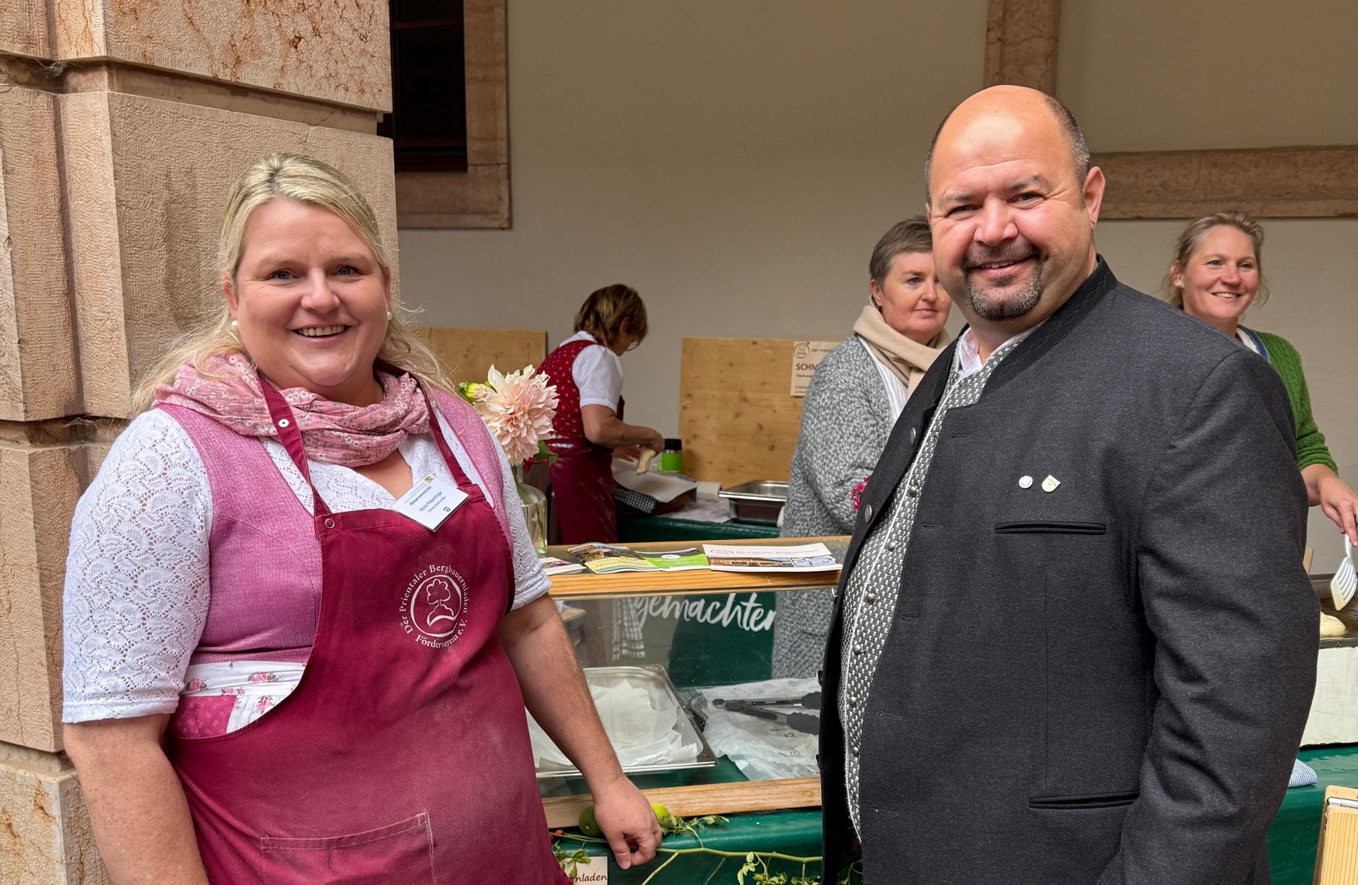 Ein fröhlicher Treffpunkt war jetzt die Bauernmarktmeile mit dem Käsegenussmarkt im Landwirtschaftsministerium in München. Das Foto zeigt den Rosenheimer Kreisobmann Sepp Andres aus Ebrach bei Pfaffing und das Kreisvorstandschafts-Mitglied Maria Riepertinger vor dem Stand des Prientaler Bergbauernladen im Landwirtschaftsministerium.