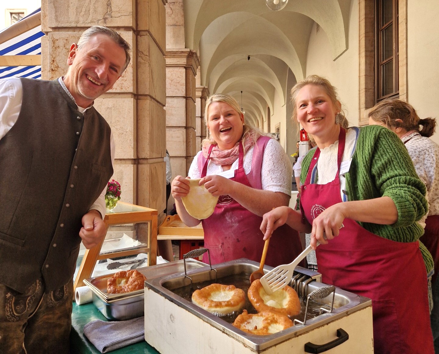 Maria Riepertinger und Bugi Gabriel erklären dem Bayerischen Bauernpräsidenten Günther Felßner das Backen der Schmalznudeln.