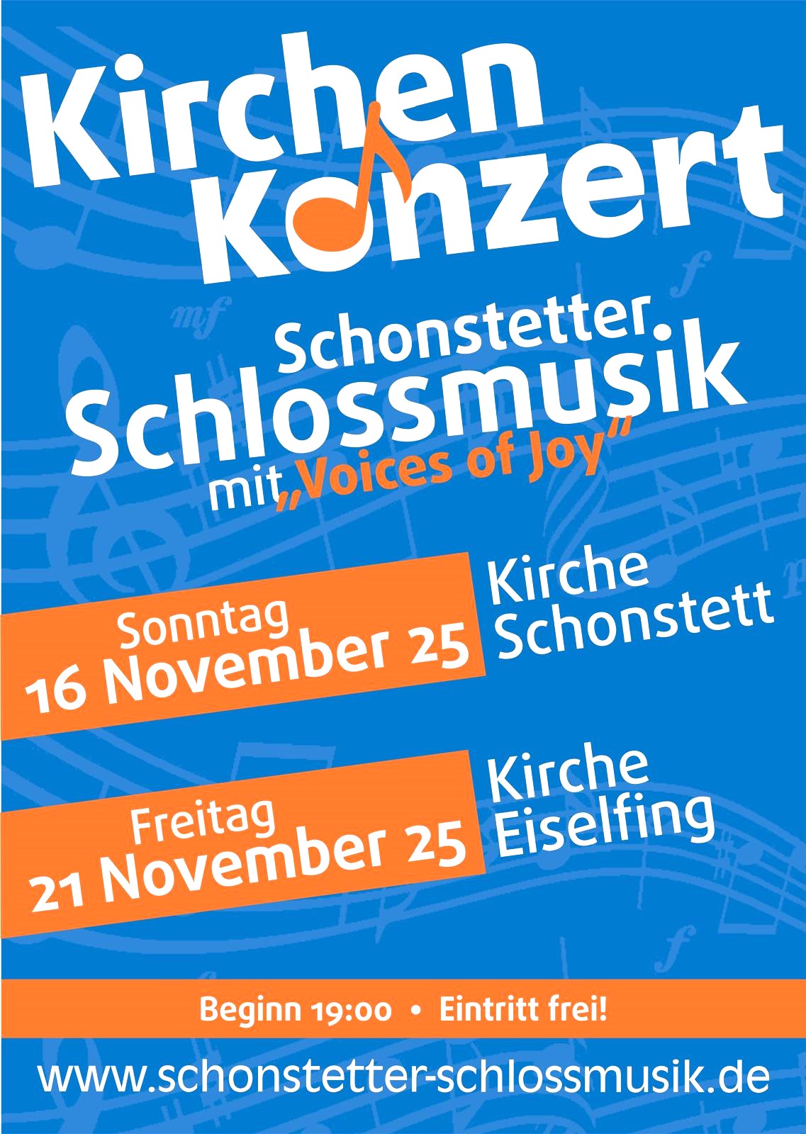 Zum Vormerken: Zwei Kirchenkonzerte der Schonstetter Schlossmusik gibt es im nächsten Monat mit „Voices of Joy“. Leidenschaftliche Musik erst in der Pfarrkirche St. Johann Baptist in Schonstett am 16. November und dann in St. Rupertus in Eiselfing am 21. November …