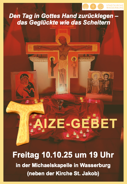 Die Stadtkirche Wasserburg lädt herzlich ein zum Taizegebet am heutigen Freitag um 19 Uhr in der Michaelskapelle (direkt neben der St. Jakobskirche) – einem Abendgebet bei Kerzenschein mit Beten, Singen und Stille zur inneren Einkehr.