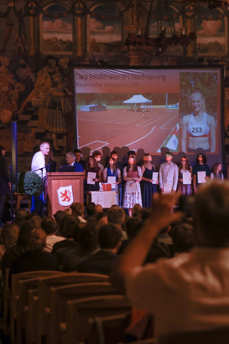 Heute sei nun der Moment gekommen, diese Erfolge zu feiern. Und darum freue er sich, dass die Stadt Wasserburg in diesem Jahr insgesamt 99 Ehrenurkunden im Rahmen des Ehrenabends verleihen kann, und zwar 23 Ehrenurkunden in Gold, 43 in Silber und 33 in Bronze. Die Ehrenurkunde in Gold werde nur verliehen an Sportlerinnen und Sportler, die bei Deutschen Meisterschaften einen ersten, zweiten oder dritten Platz erreicht hätten. Und dass das in Wasserburg in den vergangenen 12 Monaten insgesamt 23 Mal habe erzielt werden können, das sei schon etwas Besonderes.