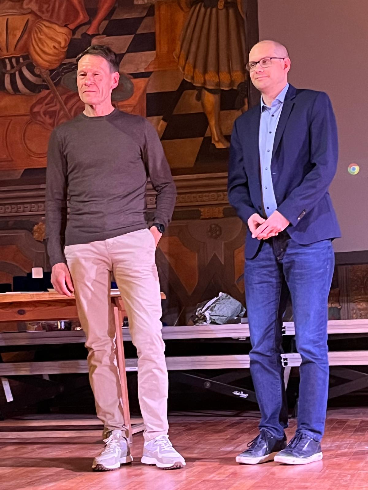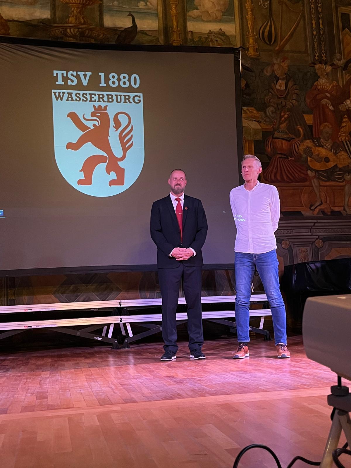 In seiner Begrüßungsansprache freute sich der Erste Vorsitzende des TSV 1880 Wasserburg, Bastian Wernthaler (hier mit dem Bürgermeister), zunächst einmal darüber, dass so viele Menschen der Einladung gefolgt seien. Er bedankte sich bei Bürgermeister Kölbl, dass er begrüßen darf, denn dieser Abend sei ja eine gemeinsame Veranstaltung der Stadt Wasserburg und des TSV 1880. Er bedankte sich bei Allen, die diesen Abend vorbereitet hätten und betonte, dass Sport so wie eine Auszeit sei. In Zeiten, wo man beobachten müsse, dass die Gesellschaft auseinanderdrifte, tue es gut zu sehen, dass der Sport die Möglichkeit habe, ebenso wie dies der Kultur, der Musik und dem Theater auch möglich sei, die Gesellschaft zusammenzuführen vermag. Sport führe Nationalitäten zusammen und wirke immer wieder generationsübergreifend. Das sei sehr schön, gerade in diesen schweirigen Zeiten. Immerhin habe der BLSV, der Bayerische Landes-Sportverband e.V., knapp 5 Millionen Mitglieder und das stimme zuversichtlich.