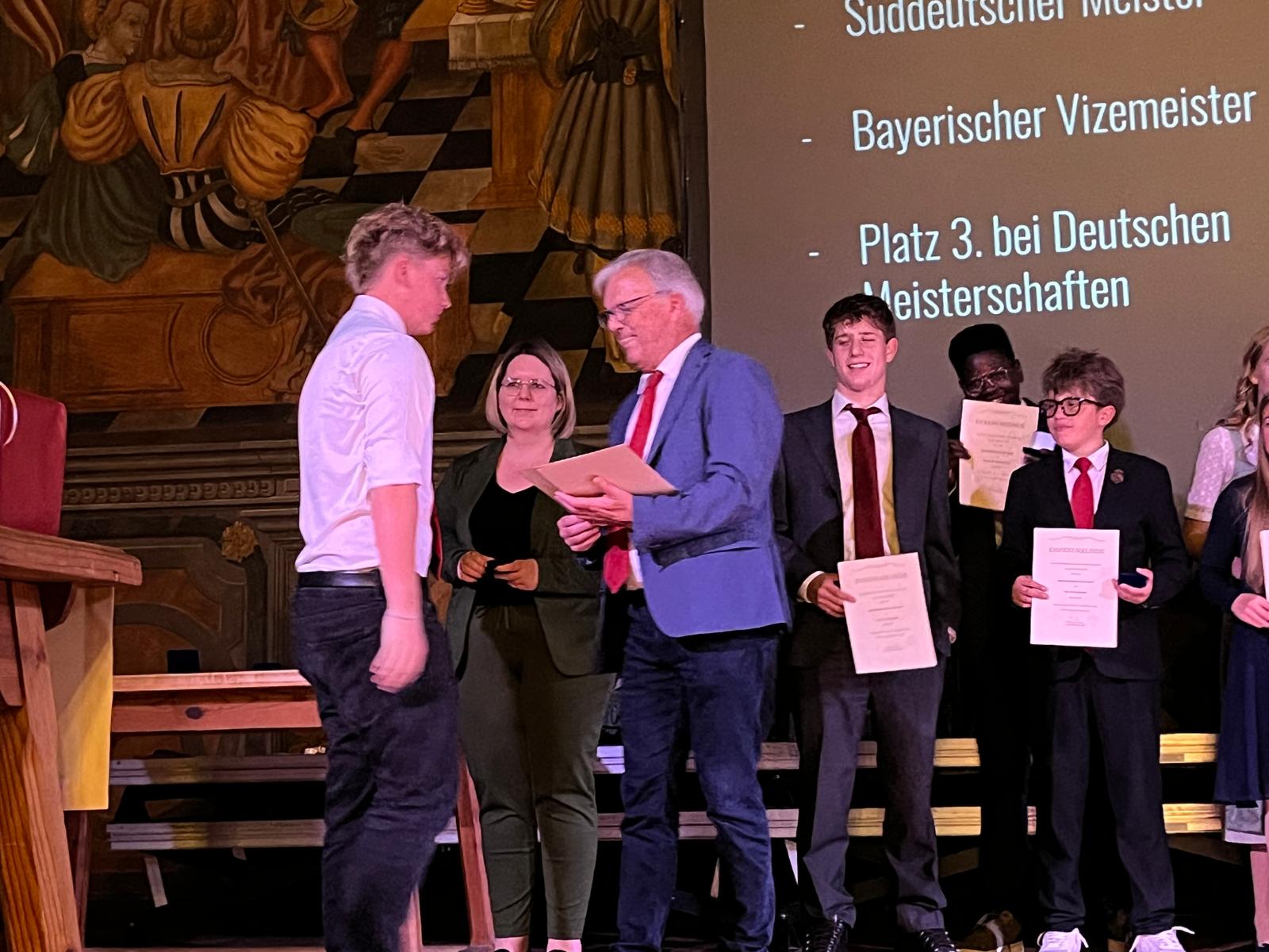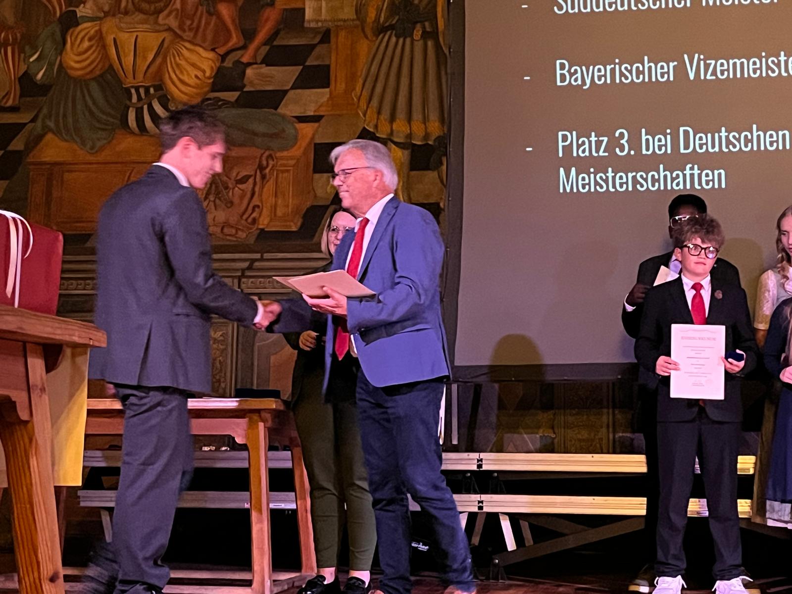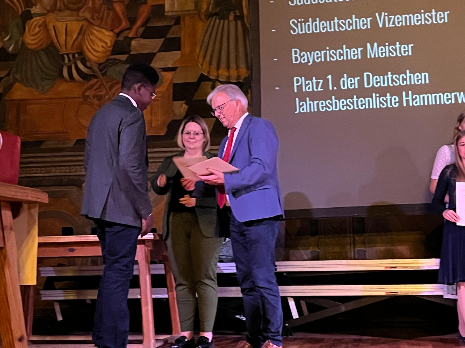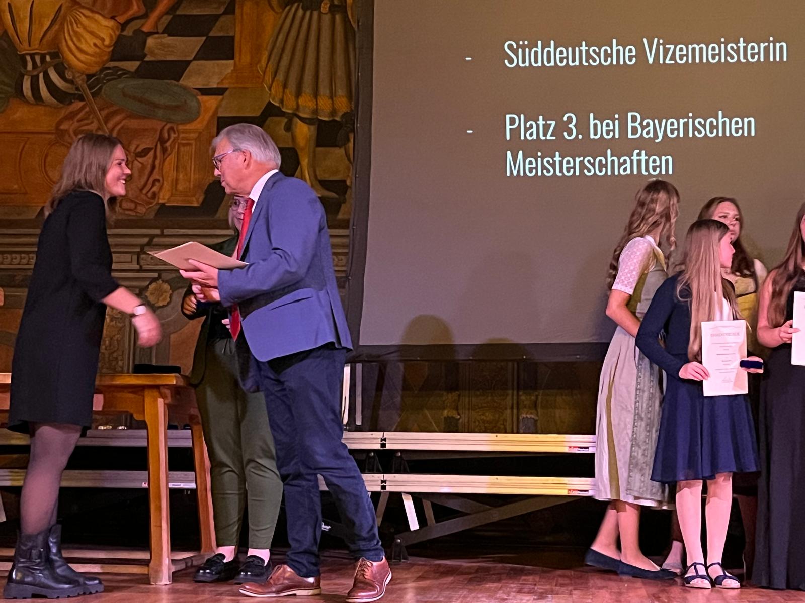 Heute sei nun der Moment gekommen, diese Erfolge zu feiern. Und darum freue er sich, dass die Stadt Wasserburg in diesem Jahr insgesamt 99 Ehrenurkunden im Rahmen des Ehrenabends verleihen kann, und zwar 23 Ehrenurkunden in Gold, 43 in Silber und 33 in Bronze. Die Ehrenurkunde in Gold werde nur verliehen an Sportlerinnen und Sportler, die bei Deutschen Meisterschaften einen ersten, zweiten oder dritten Platz erreicht hätten. Und dass das in Wasserburg in den vergangenen 12 Monaten insgesamt 23 Mal habe erzielt werden können, das sei schon etwas Besonderes.