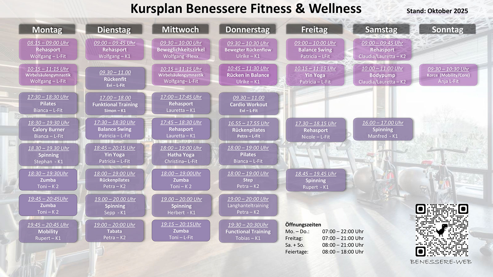 „Unser Ziel ist es, jedem die Möglichkeit zu bieten, etwas für die eigene Gesundheit und Fitness zu tun – egal ob Anfänger oder Fortgeschrittener“, betont das BENESSERE-Team. Das vielseitige Kursangebot lädt dazu ein, neue Trainingsmethoden auszuprobieren und gleichzeitig aktiv etwas für Körper und Wohlbefinden zu tun.