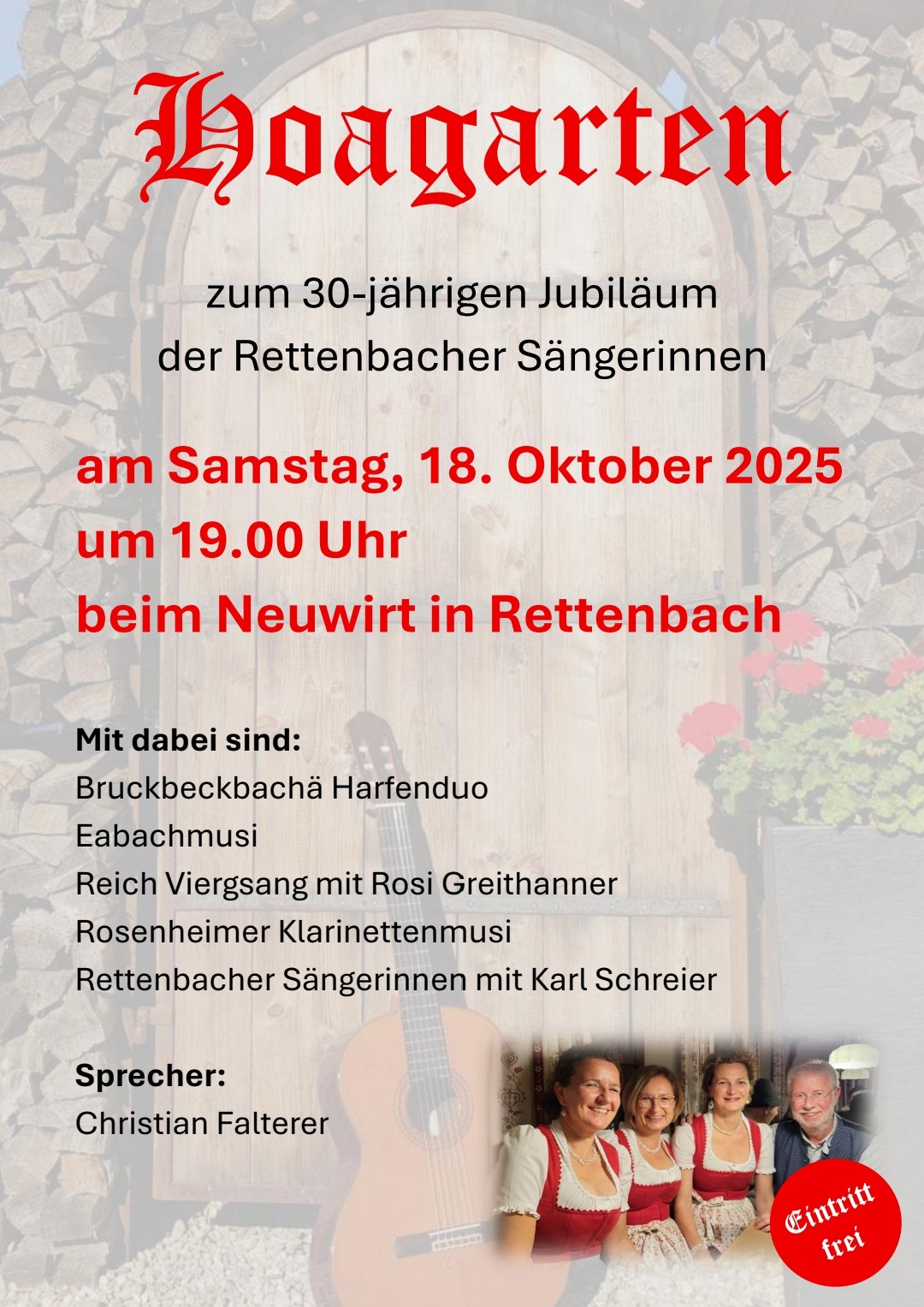 Seit nun 30 Jahren singen sie in der jetzigen Besetzung. Am Samstag nun laden Gabi, Rosina und Monika – musikalisch begleitet von Karl Schreier – die Freunde traditioneller Volksmusik um 19 Uhr beim Neuwirt in Rettenbach zu einem „Hoagarten“ ein. Der Eintritt ist frei.