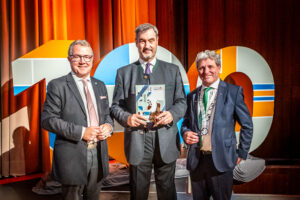 „Die TH Rosenheim hat ein funktionierendes und ambitioniertes Team, das gerne mit neuen Ideen bei uns in München um die Ecke kommt. Wir wissen dann schon, dass es wieder teuer werden könnte, aber bislang haben wir noch keine Investition bereut“, sagte Söder mit einem Augenzwinkern. Angesichts der Herausforderungen der Zukunft betonte er: „Wir brauchen euren Ideenreichtum und eure Dynamik auch weiterhin. Nehmt den Schwung mit für die nächsten 100 Jahre!“ Nach seinem Auftritt bekam der Ministerpräsident vom Hochschulratsvorsitzenden Klaus Stöttner das erste Exemplar der Chronik überreicht, die anlässlich des 100-jährigen Jubiläums erstellt wurde.