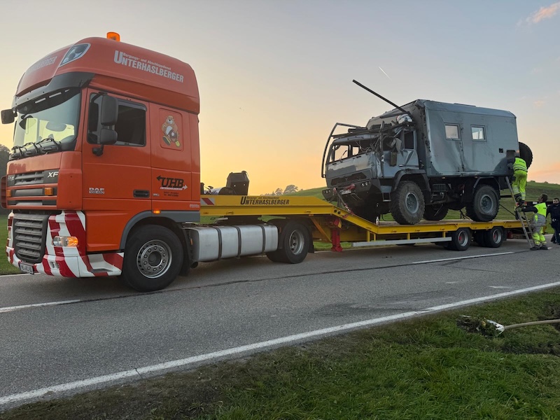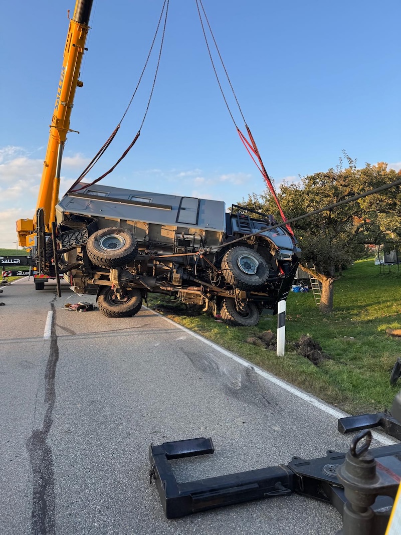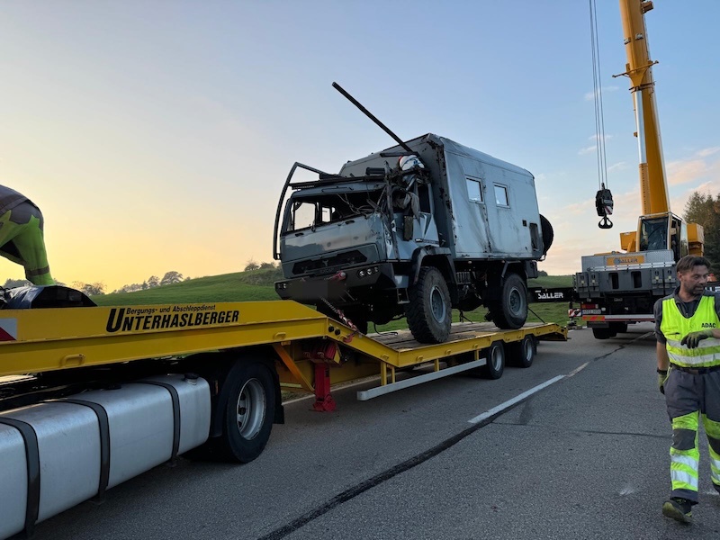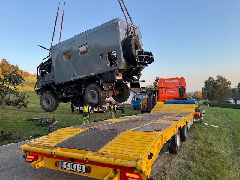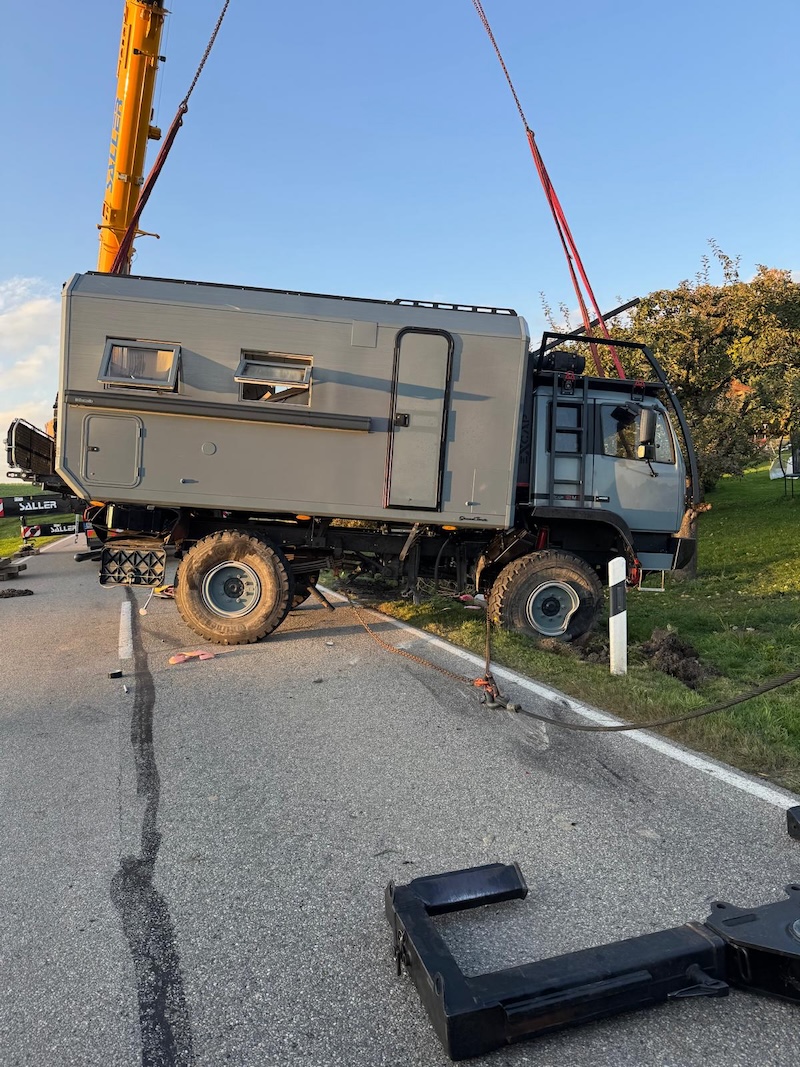 Für die Sicherung der Unfallstelle wurde die Feuerwehr hinzugezogen. Ein Abschleppdienst musste mit einem großen Bergekran das Expeditionsmobil aufstellen und auf einen Tieflader heben.