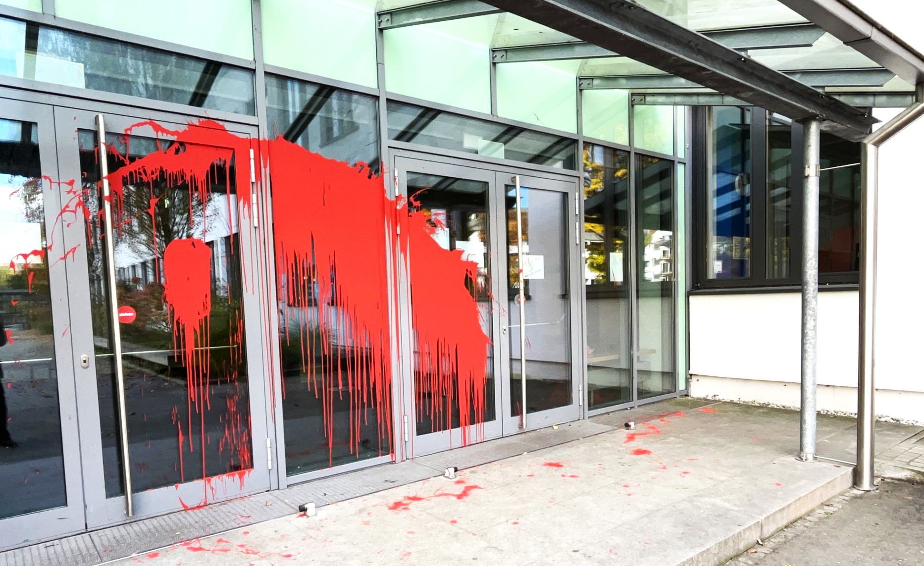 Die Türen sowie Fassade wurde mit roter Farbe – nach Spurenlage – geradezu überschüttet. Tatzeit war die Nacht zum gestrigen Samstag, so die Polizei heute.