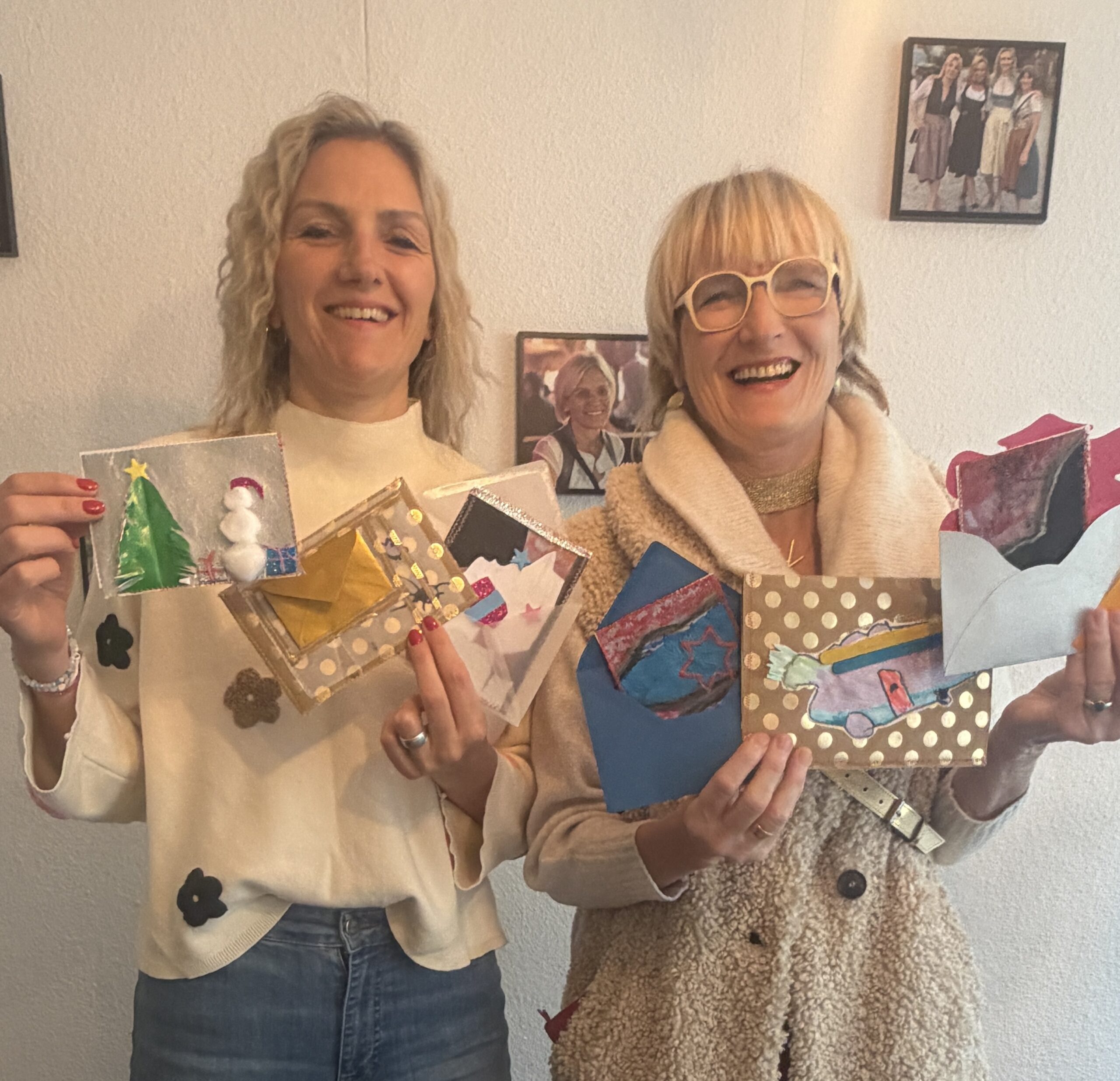 Das Foto oben zeigt Sibylle Schuhmacher (links) und Katrin Meindl mit Weihnachtskarten, die von Kindern schon mal probeweise angefertigt wurden. Fotos unten: Kinder im Ganserhaus beim Ferienprogramm der Stadt.