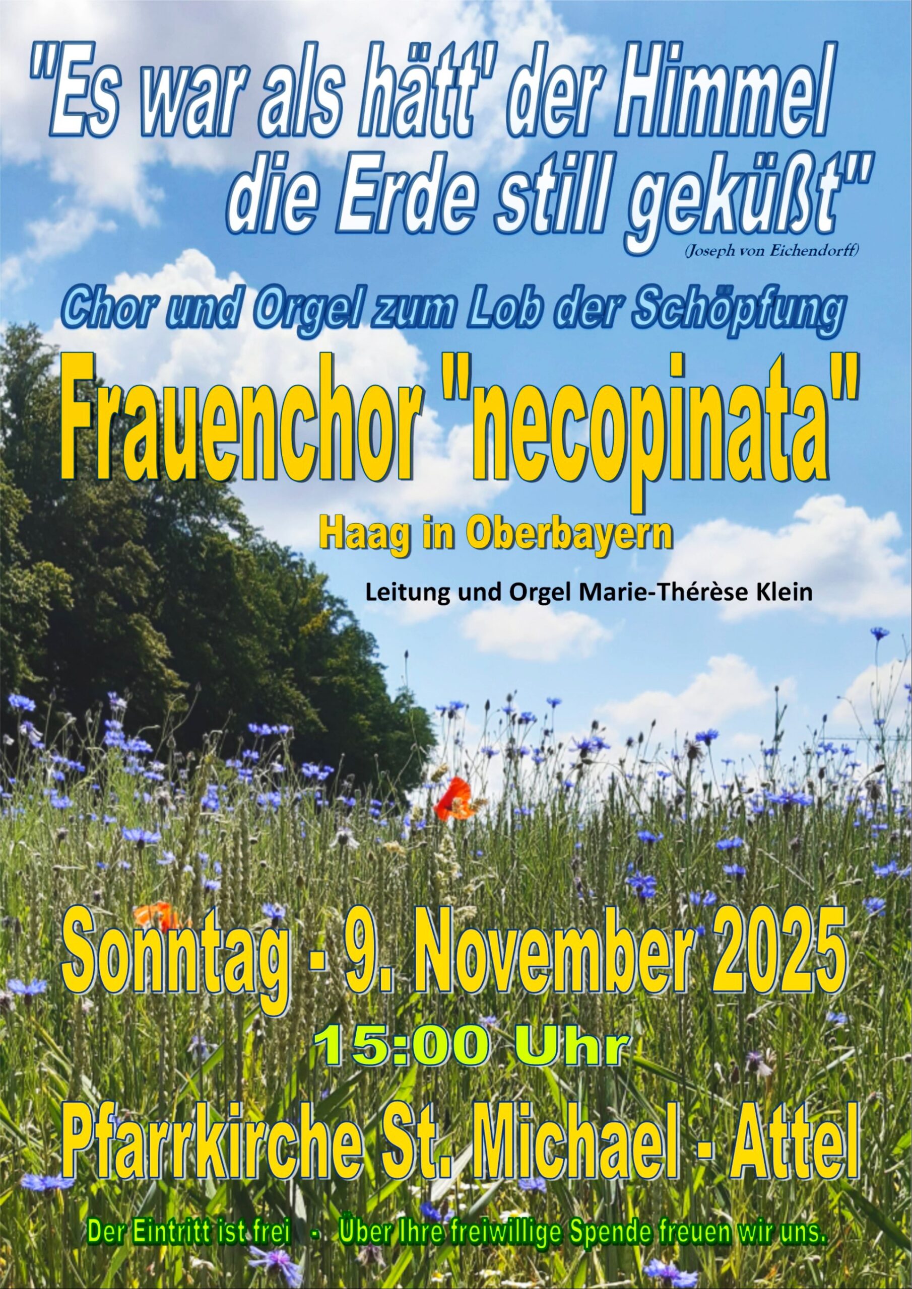 „Es war, als hätt‘ der Himmel, die Erde still geküsst“: Diese Zeile aus dem berühmten Gedicht „Mondnacht“ wurde um 1835 von Joseph von Eichendorff, einem der bedeutendsten Dichter der deutschen Romantik, verfasst. Die Zeile ist mit Inspiration zum Konzert mit dem Frauenchor „necopinata“ aus Haag am Sonntag, 9. November, um 15 Uhr in der Attler Kirche. Zum Lob der Schöpfung …