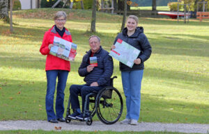 Gefreut hat sich der Aschauer Gerhard Habermeier (Mitte), der als Erster das druckfrische Faltblatt am Fuße von Schloss Hohenaschau überreicht bekommen hat. Das handliche Faltblatt liefert neben der Karte auch viele nützliche Informationen und detaillierte Beschreibungen zu den einzelnen Touren – für entspannte Ausflüge im Priental. Ein kleines Faltblatt mit großer Wirkung für mehr Teilhabe und Inklusion.