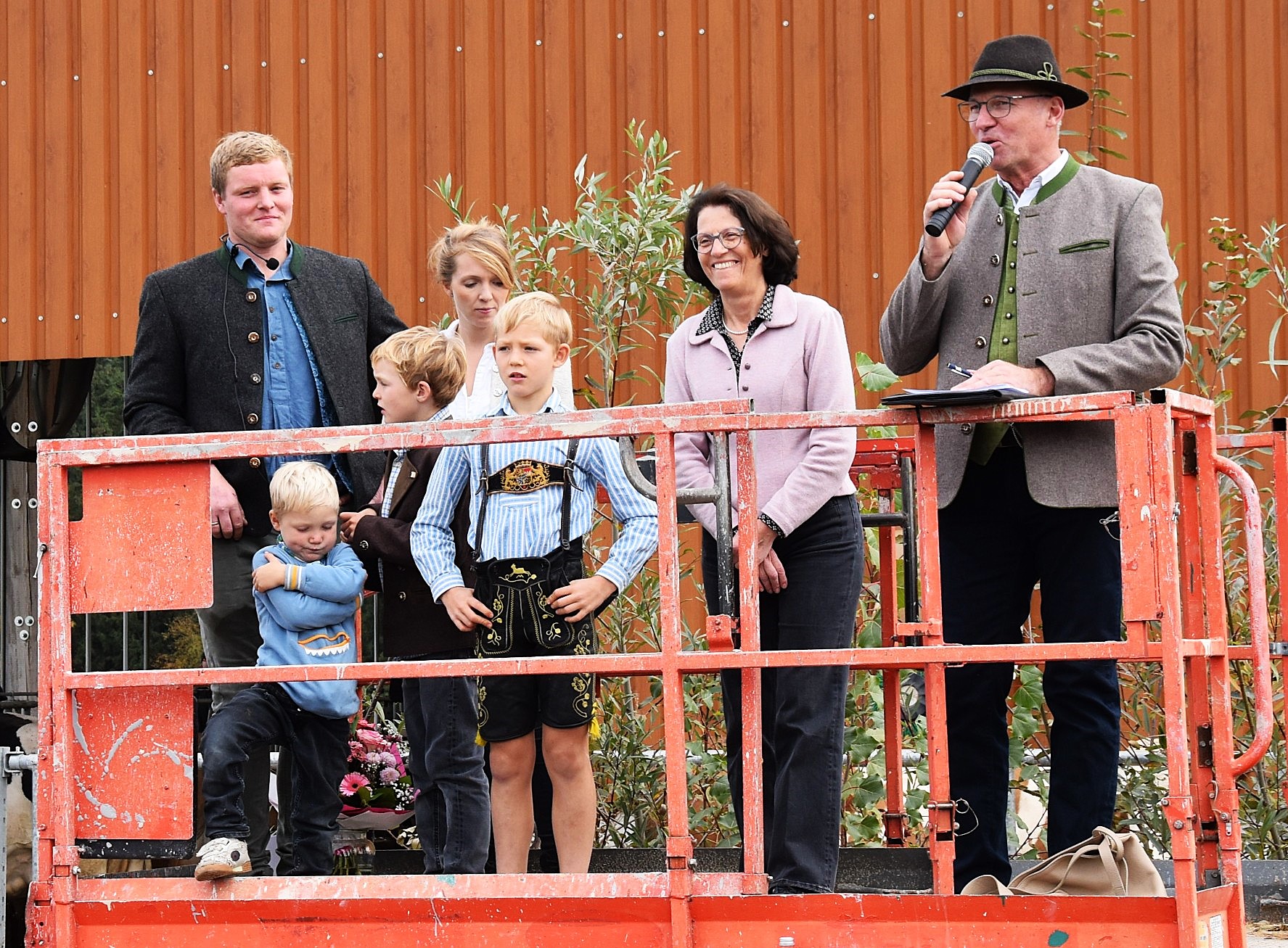 Begrüßung von der Arbeitsbühne – von links Georg und Jenny Dürr mit den Söhnen Anton, Quirin und Georg sowie Behörden-Leiterin Anna Bruckmeier und Verbands-Vorsitzender Josef Grandl.
