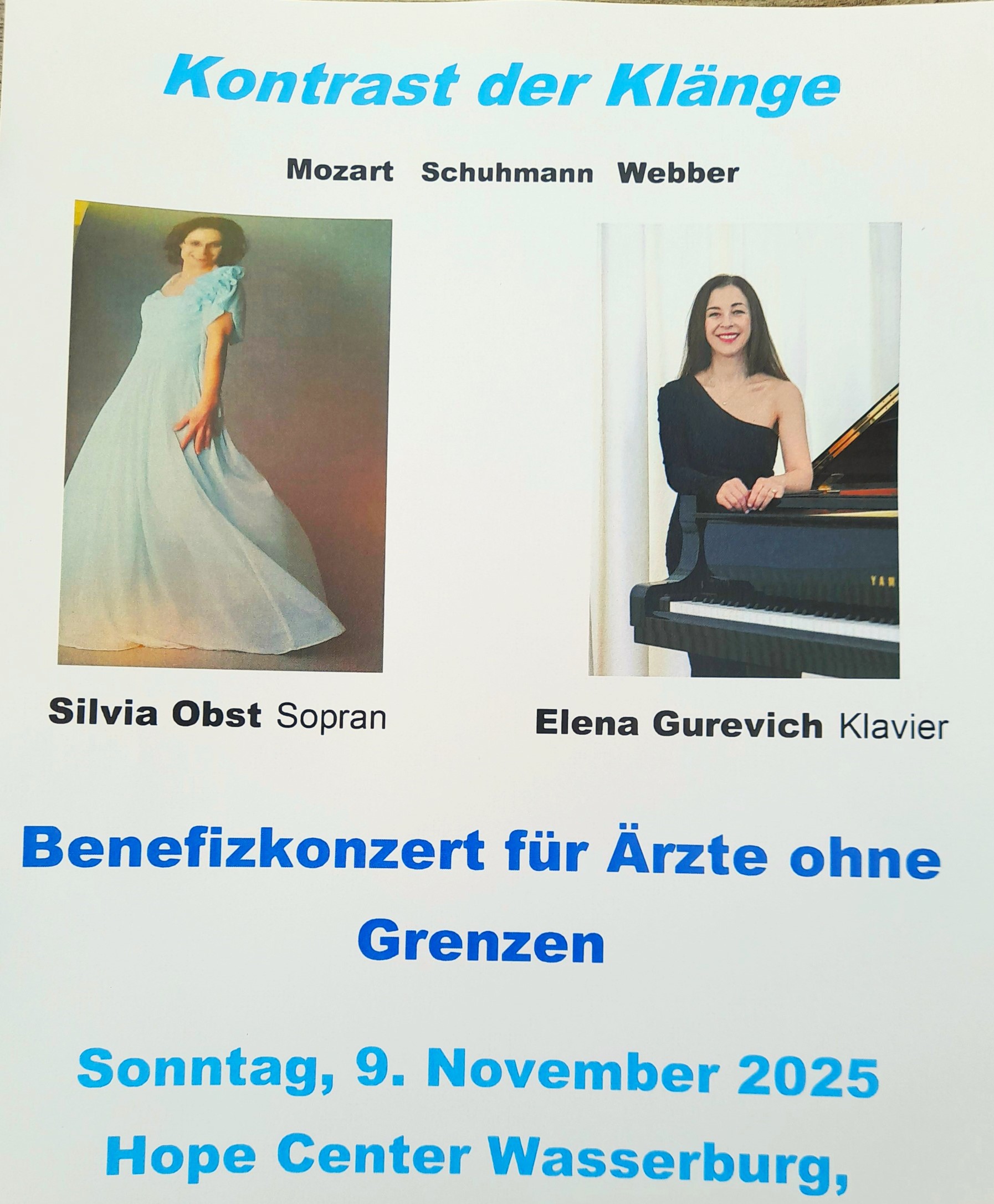 Ein Benefizkonzert für „Ärzte ohne Grenzen“ im großen Saal des Hope-Zentrums in Wasserburg: Ein Ort der Hoffnung, wo Menschen einander begegnen und nun am Sonntag, 9. November, ein Konzert-Ort für „Ärzte ohne Grenzen“, die Menschen ein Leben voller Hoffnung und Zukunft ermöglichen – in Ländern, wo es keine ausreichende Gesundheits-Vorsorge gibt.