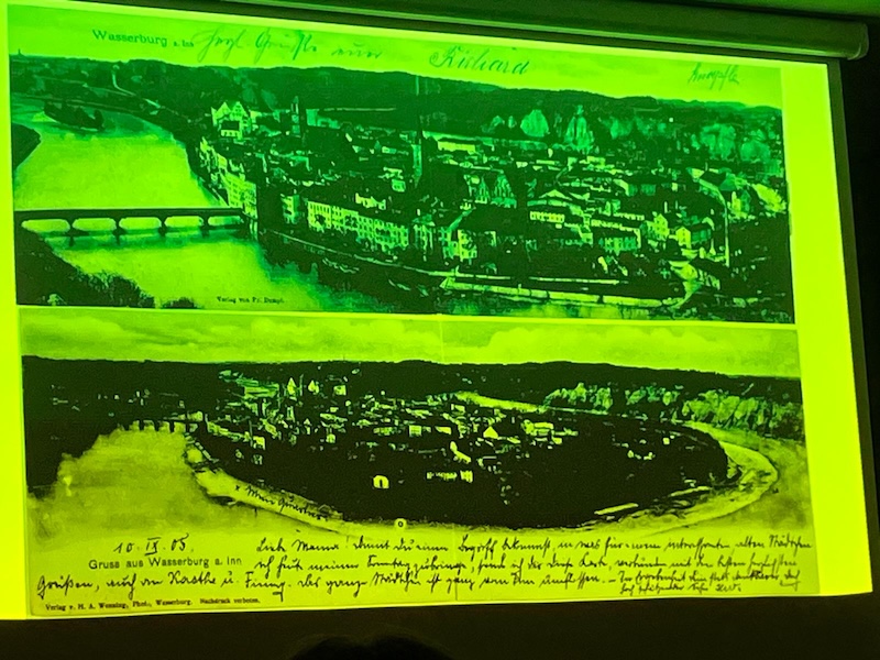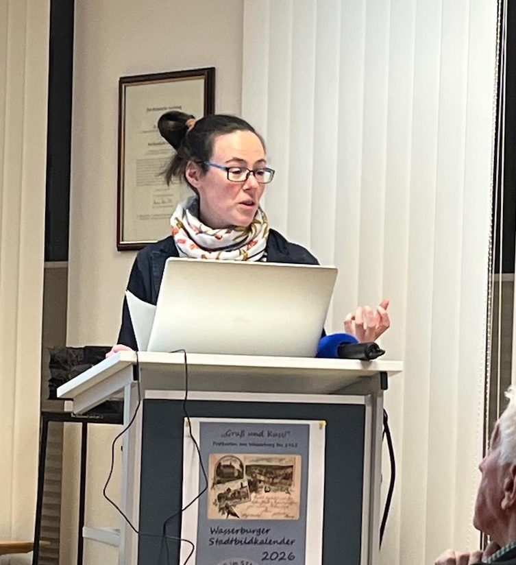Und beim Wasserburger Stadtbildkalender, der nun zum neunten Male erscheine, habe man sich in diesem Jahr auf Postkarten konzentriert. Sonja Fehler umriss anschließend eine kleine Kulturgeschichte der Postkarte. In den 1860-er Jahren sei sie entstanden und der vornehmlich Zweck sei die Beschleunigung der Kommunikation gewesen. Post sei seinerzeit bis zu dreimal am Tag zugestellt worden und so konnte es geschehen, dass eine Postkarte, am Morgen eingeworfen, bereits am Abend ihren Empfänger erreichte. Sie erwähnte Heinrich von Stephan, den späteren Generalpostdirektor im Deutschen Reich, der bereits 1865 die Einführung einer Postkarte anregte. Durch den Ausbau des Bahnverkehrs in Deutschland sei die Postkarte dann noch schneller geworden und habe so einen Siegeszug im Postwesen antreten können. Anonymität sei weniger wichtig als die Schnelligkeit gewesen, ergänzte Fehler in ihren Ausführungen.