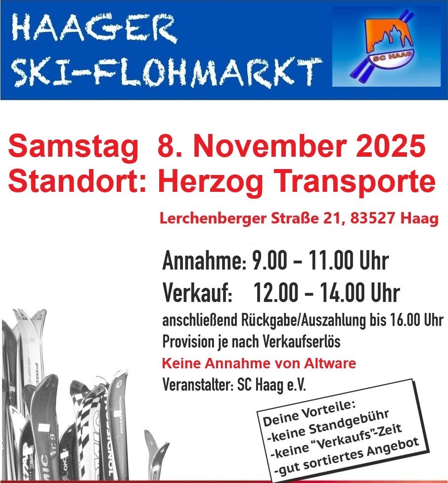 Nächste Woche am Samstag, 8. November, findet bei Herzog-Transporte an der Lerchenberger Straße 21 in Haag wieder der beliebte Ski-Flohmarkt des Skiclubs Haag statt.