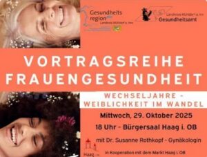 Gesundheitsamt und Gesundheitsregion-plus Mühldorf laden in Kooperation mit dem Markt Haag am morgigen Mittwoch, 29. Oktober, ab 18 Uhr zu einem Vortrag von Dr. Susanne Rothkopf zum Thema Vortrag zum Thema „Wechseljahre“ ein.