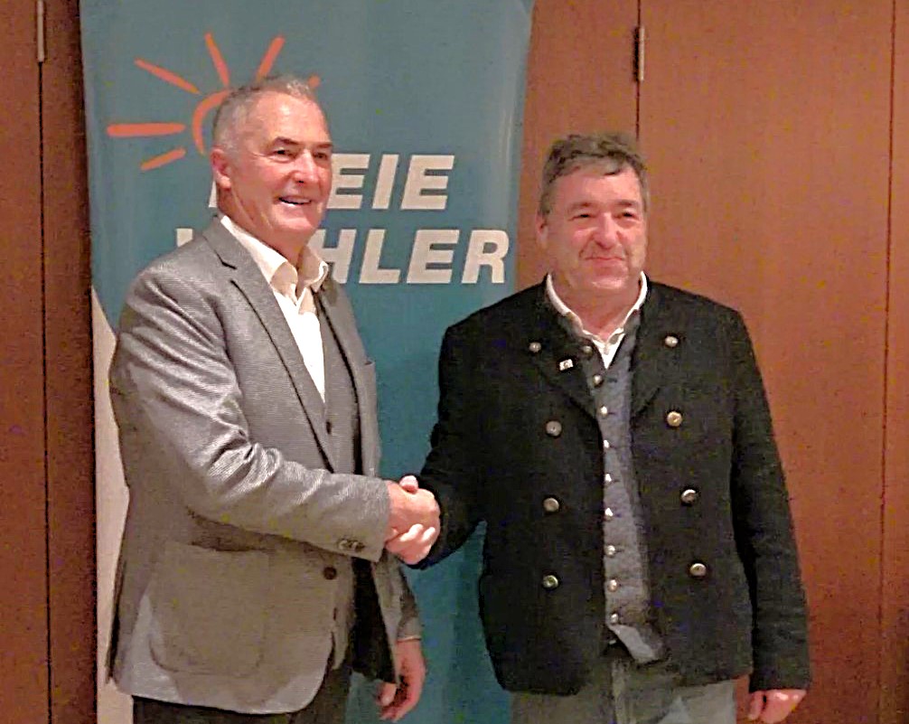 Die Freien Wähler im Landkreis Rosenheim haben jetzt Bezirksrat Sepp Hofer aus Halfing (links im Bild) zu ihrem Landrats-Kandidaten bei der Kommunalwahl am 8. März 2026. Dieser konnte zu Beginn der Aufstellungsversammlung zahlreiche Gemeinderäte, Bürgermeister und Bürgermeister-Kandidaten, viele Kreisräte, zwei Bezirksräte und einen Landtagsabgeordneten im gut besetzten Saal begrüßen.