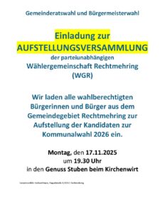 Am Montag, 17. November, findet um 19.30 Uhr, beim Kirchenwirt die Aufstellungsversammlung der parteiunabhängigen Wählergemeinschaft Rechtmehring (WGR) statt.