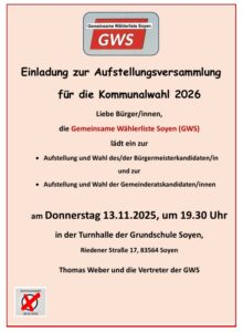 Am kommenden Donnerstag, 13. November, findet um 19.30 Uhr, in der Grundschule Soyen die Aufstellungsversammlung der „Gemeinsamen Wählerliste Soyen“ (GWS) statt.
