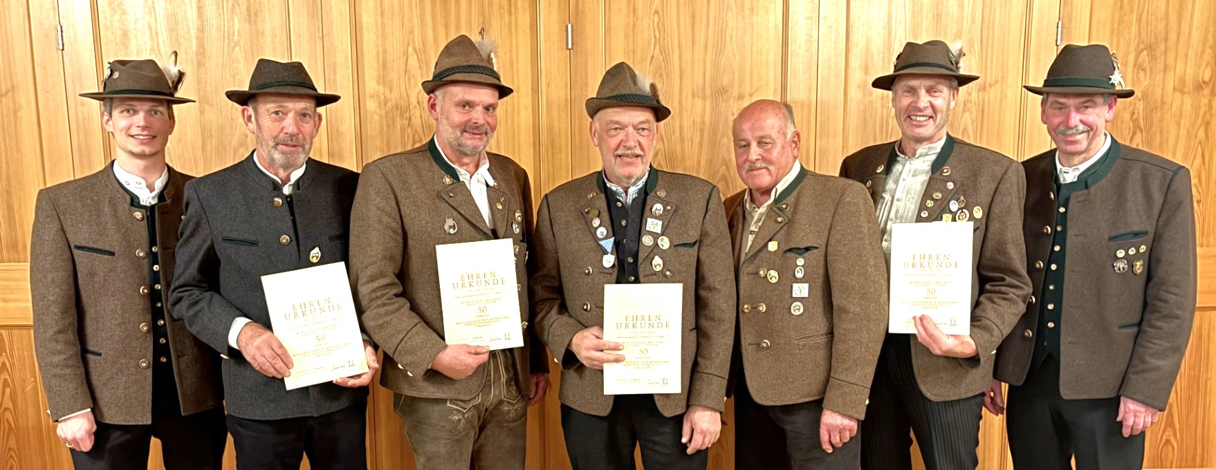 Einige Ehrungen für langjährige (40 und 50 Jahre) Mitgliedschaften standen an. Dazu durfte die Versammlung Gauschützenmeister Helmut Schwarzenböck (ganz rechts im Bild) begrüßen. Er lobte ausdrücklich das Engagement des gesamten Vereins und im Besonderen der Vorstandschaft. Er betonte, dass der Zusammenhalt im Verein stimme und neben den sehr guten sportlichen Leistungen auch das gesellschaftliche nicht zu kurz komme. Die Jugendarbeit bei der SG Eiselfing lobte er im Besonderen, denn die Jugend bekäme Freiraum, aber auch Verantwortung übertragen, was sich an der bunten Mischung aus Jung und Alt widerspiegle und besonders wichtig sei, um den Verein langfristig zu erhalten. Er lobte zudem, dass dies im Verein schon früher sehr gut klappte und bedankte sich dafür bei den langjährigen Mitgliedern, denen er die Urkunden anschließend persönlich ausgab.