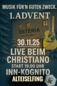 Wie jedes Jahr am 1. Advent gibt es auch heuer wieder Live-Musik in der Osteria Christian in Alteiselfing.