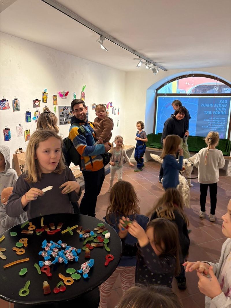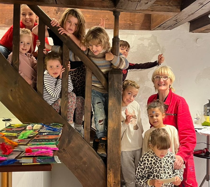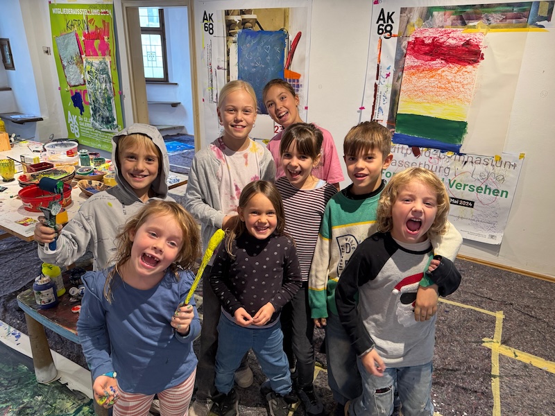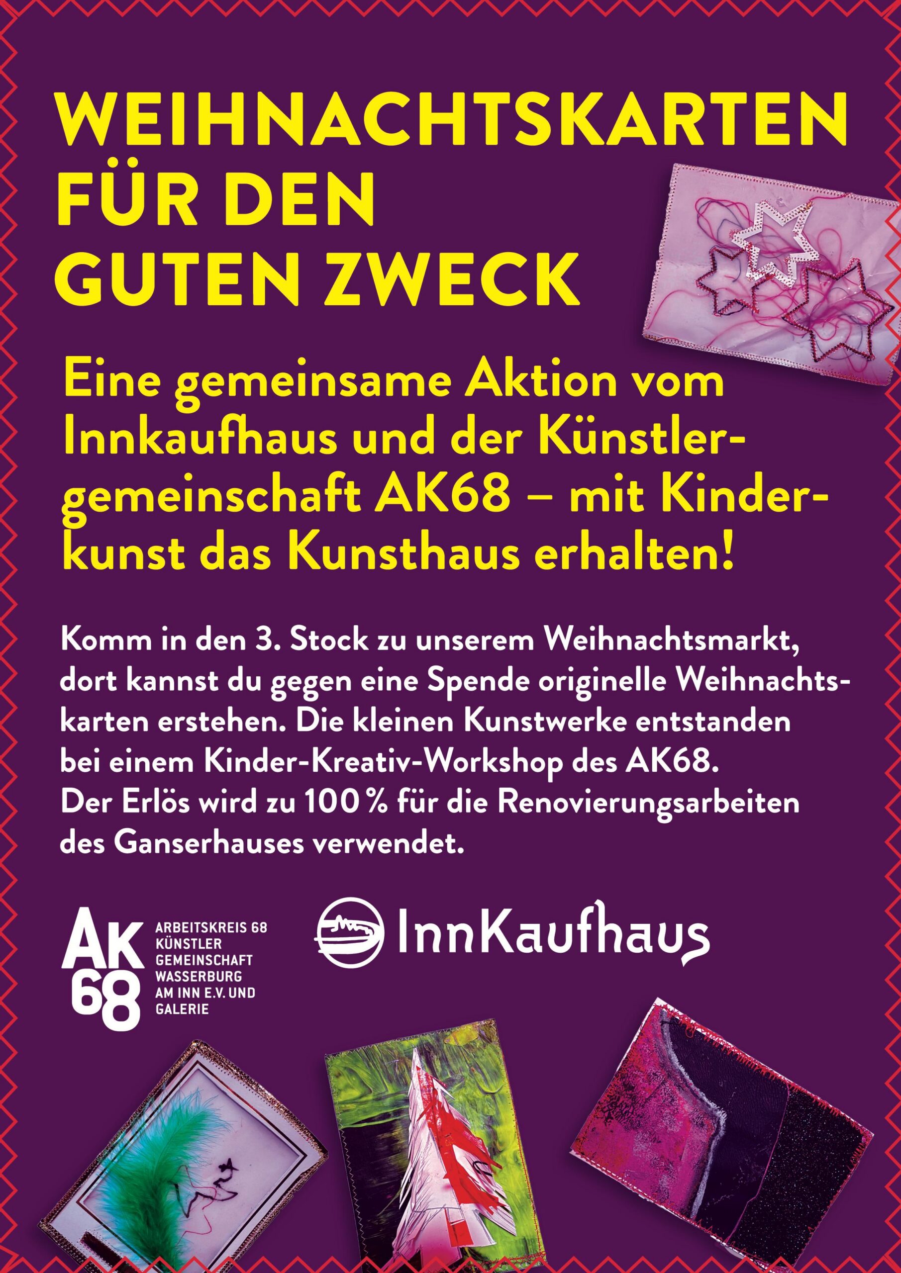 „Wir müssen zehn Prozent der Sanierungskosten von rund 600.000 Euro als Verein selbst aufbringen, damit die Zuschüsse fließen“, ergänzt Katrin Meindl, Vorsitzende der Künstlergemeinschaft (Foto mit den Kindern). Deshalb sei man froh, dass das Innkaufhaus heuer mit seiner Weihnachtsaktion das kulturelle Projekt unterstützt. „Und das ist auch noch ein ganz besonderes: Wir bringen Kinder und Kultur zusammen„, so Meindl. Denn: Kleine Künstler ab fünf Jahren konnten in den Herbstferien nicht nur das Ganserhaus entdecken, sondern auch noch kleine Kunstwerke selber anfertigen – Weihnachtskarten, die ab sofort für den guten Zweck im Innkaufhaus gegen eine Spende zu haben kann. Mindest-Spende pro Karte: 5 Euro. Natürlich darf man auch mehr für den guten Zweck geben.