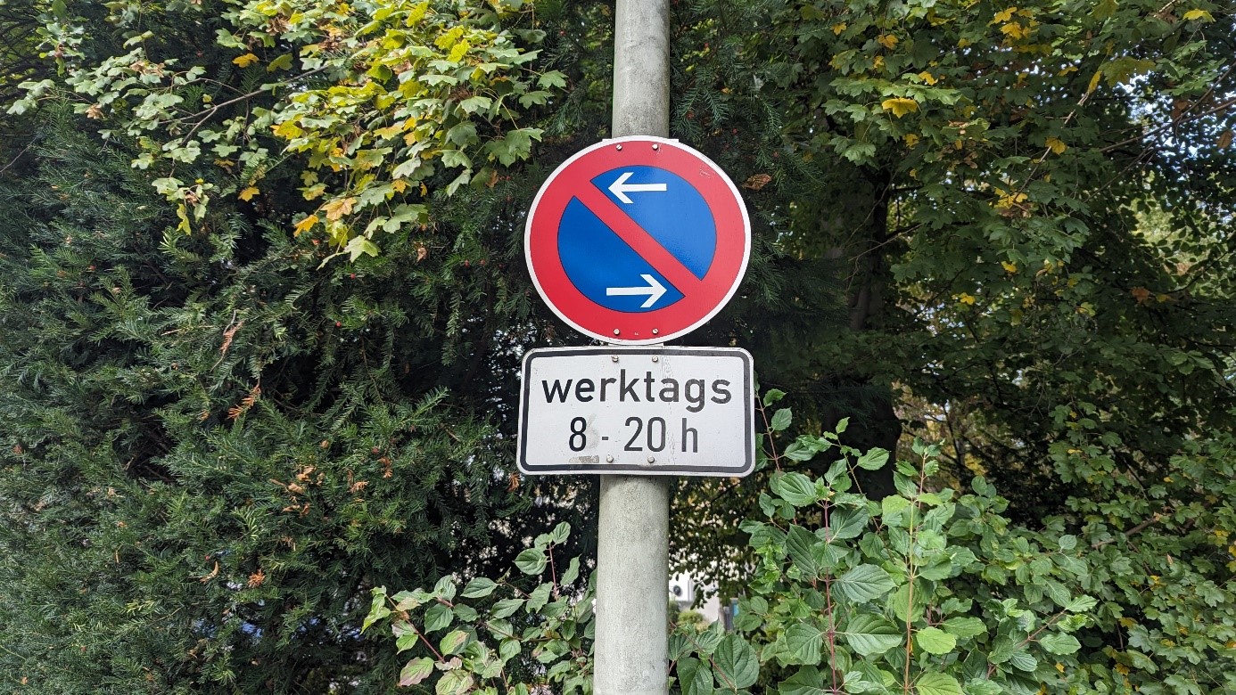 Das Bild oben zeigt ein Beispiel für ein eingeschränktes Haltverbot in Rosenheim, das nur an Werktagen zwischen 8 Uhr und 20 Uhr gilt.