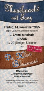 Seit 20 Jahren gibt es nun schon „De Kloa Blosmusi“. Das nehmen die sieben Musikanten mit ihrem „Musimoaster“ Hans Haslberger zum Anlass, die Bevölkerung zum Mitfeiern einzuladen. Am Freitag, 14. November, öffnet „Grandls Hofcafé“ die Tore zur „Musiknacht mit Tanz“ mit der „Kloan Blosmusi“. Beginn ist um 20 Uhr. Mit dabei sind die „Junge Oarkarrer Musi“.