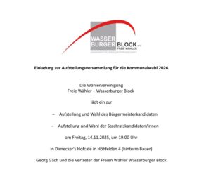 Am Freitag, 14. November, findet um 19 Uhr in Dirnecker´s Hofcafé die Aufstellungsversammlung der „Freien Wähler – Wasserburger Block“ statt.