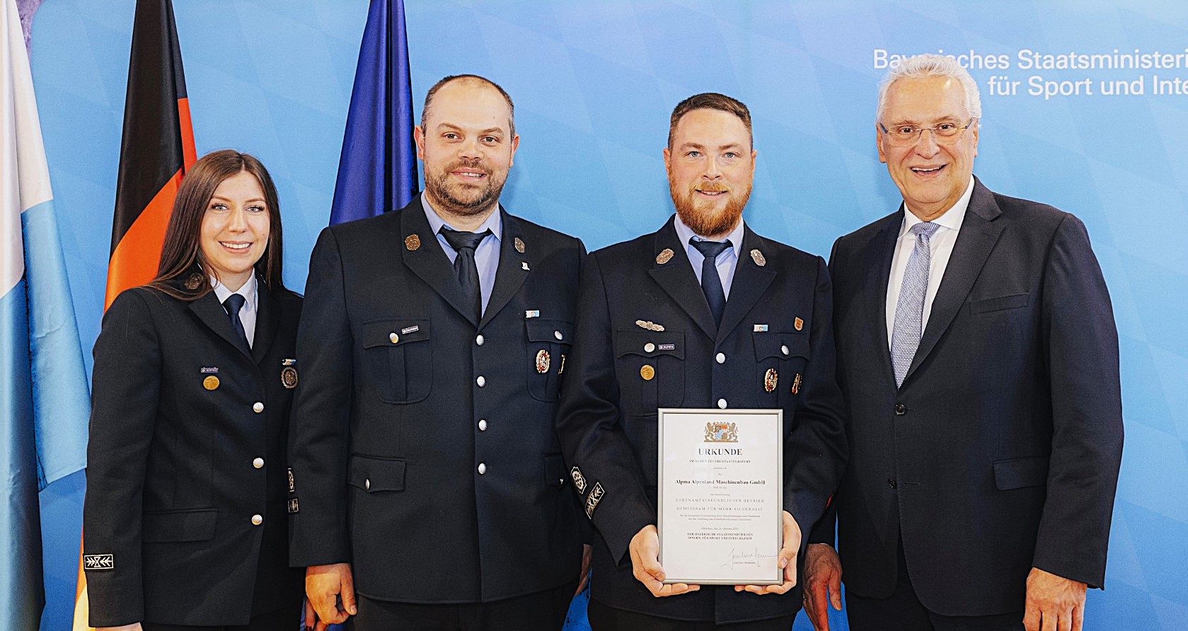 Stellvertretend für ALPMA nahmen drei Kolleginnen und Kollegen, die sich neben ihrer Tätigkeit im Unternehmen auch in der Freiwilligen Feuerwehr Rott engagieren, diese tolle Auszeichnung persönlich entgegen.
