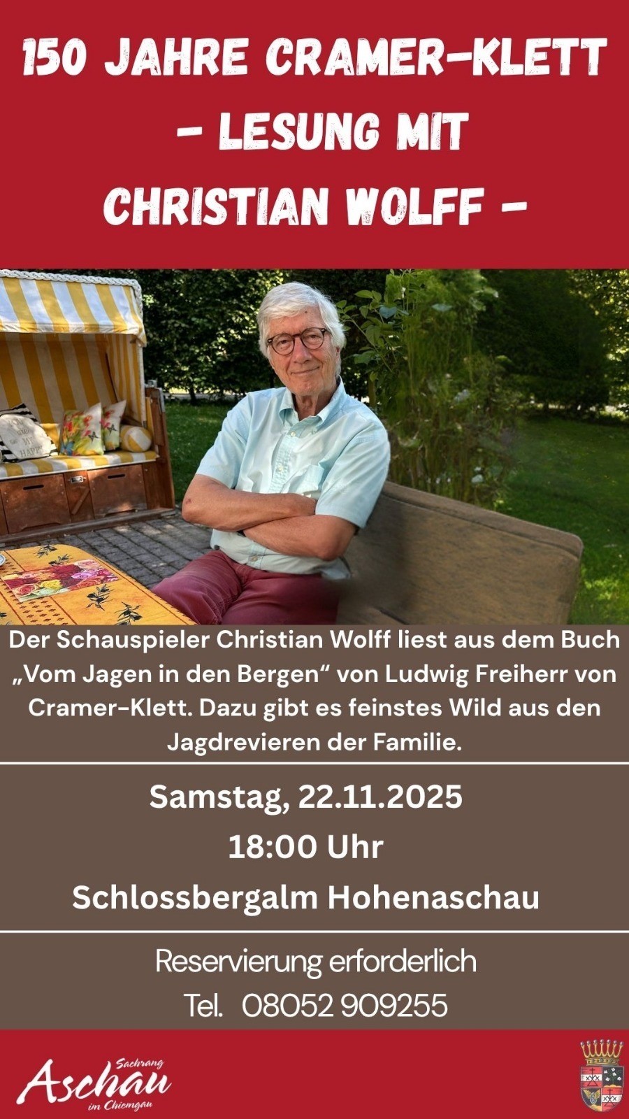 Der Aschauer Schauspieler Christian Wolff liest ehrenamtlich für seine Heimatgemeinde aus den originalen Jagdaufzeichnungen von Baron Ludwig von Cramer-Klett. Mit seiner eindrucksvollen Stimme will Wolff die Jagderlebnisse vergangener Zeiten zum Leben erwecken und die Zuhörer in die Welt des Barons – zwischen Naturverbundenheit, Jagd und Tradition – entführen.