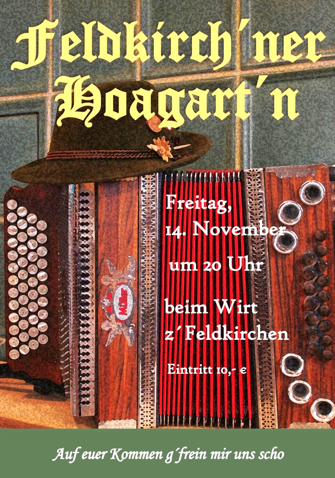 Zu einem „griabign Hoagartn“ sind Jung und Alt am kommenden Freitag, 14. November, beim Wirt in Feldkirchen herzlich eingeladen. Ab 20 Uhr wartet ein schönes, musikalisches Programm rund um die Feldkirchner Sänger. Der Eintritt kostet zehn Euro.